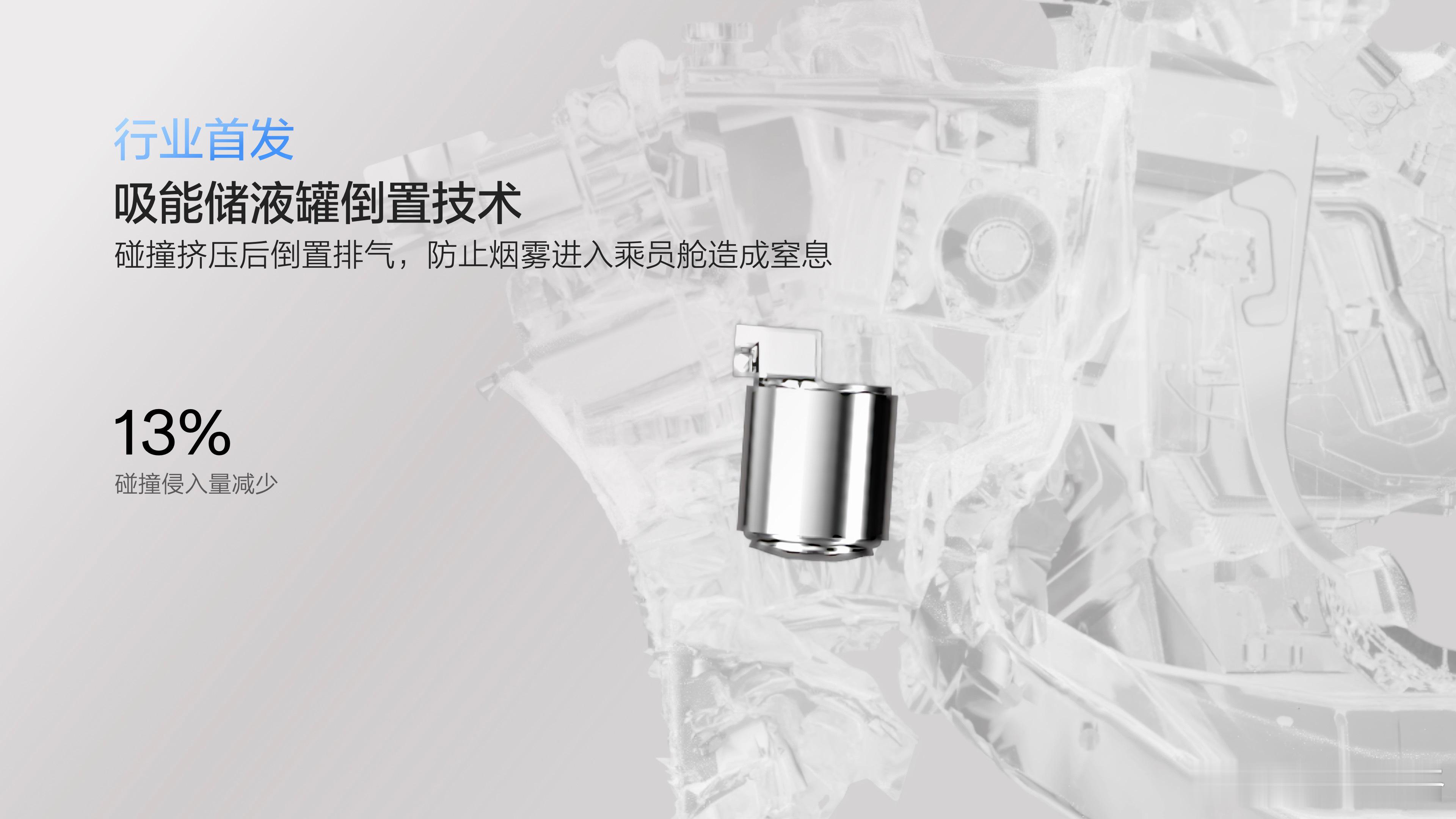 2. 吸能储液罐倒置技术,对于正面严重碰撞,也是严重那种,更好吸能,也防止液体带来二次刺激伤害