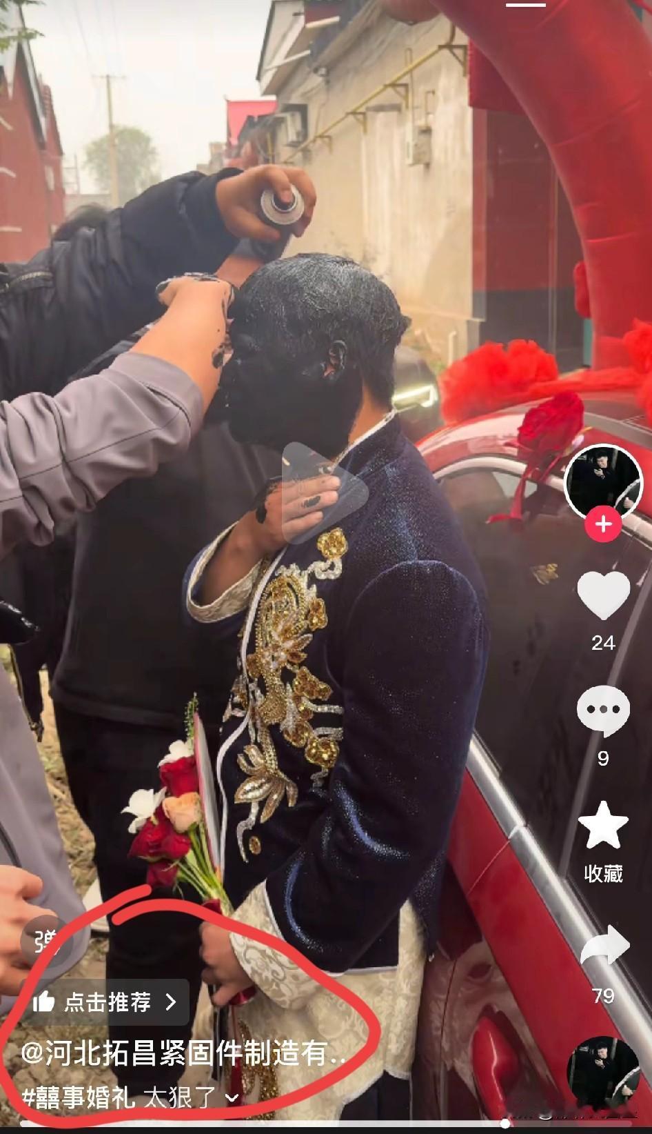 这简直恶俗至极! 近日,一位河北网友发布的视频显示,某地一场婚礼上,新郎被几人围着,脸上和头上被涂满黑色。 我们都知道,给新郎抹黑在很多地方是一种婚俗,在我们河北邯郸给新郎脸上被抹黑被认为是一种祝福,象征着婚后生活红火、家庭幸福美满。还有一种说法是源于一个故事,旨在驱邪避灾。而在其他地方会认为多子多福。 然而,这位新郎被几个男子涂抹得满脸满头漆黑,看得出他们用的并非普通的锅底黑,可能是黑鞋油这类含化学成分的东西。他们并非只抹一点,而是涂了厚厚的一层。 更让人难以忍受的是,有人还往新郎头上喷了疑似发胶的东西,把新郎丑化得如同非洲黑人一般。 暂且不论这是河北哪个地方的习俗,这种做法实在太过分了。 闹婚本是为了增添喜庆热闹的氛围,但过度闹腾就成了恶搞,这不仅会伤害新郎,也背离了喜事追求喜庆热闹的初衷。 有网友根据发布视频的抖音IP地址和昵称分析,此事可能发生在邯郸永年洺关一带,不过该信息的准确率尚不确定。 对此,大家怎么看待这件事?欢迎大家评论区留言讨论!你支持这种陋习吗? 邯郸 婚礼习俗争议 婚礼陋俗 邯郸结婚抹黑