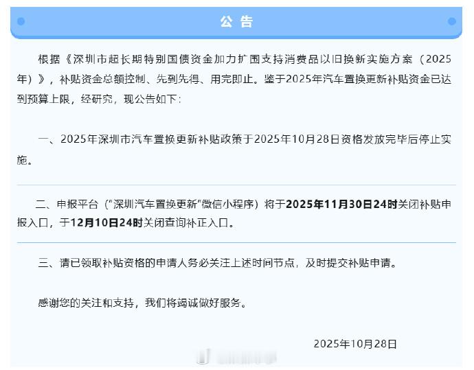 【深圳汽车置换更新补贴今日停止实施】10月28日,深圳市商务局发布公告,根据《深圳市超长期特别国债资金加力扩围支持消费品以旧换新实施方案(2025年)》,补贴资金总额控制、先到先得、用完即止。鉴于2025年汽车置换更新补贴资金已达到预算上限,2025年深圳市汽车置换更新补贴政策于2025年10月28日资格发放完毕后停止实施。同时申报平台(“深圳汽车置换更新”微信小程序)将于2025年11月30日24时关闭补贴申报入口,于12月10日24时关闭查询补正入口。
