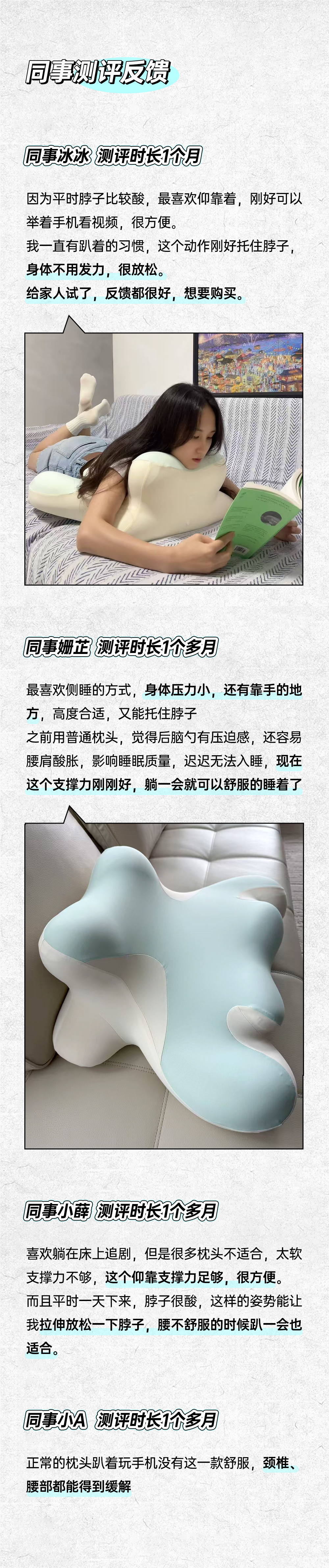 我们每个人习惯不一样,喜欢的姿势也有所不同,像我最喜欢靠着和睡觉用,还有其他同事的反馈我都放在图8里了,你们可以参考参考,每个人都能找到自己最舒服的用法。