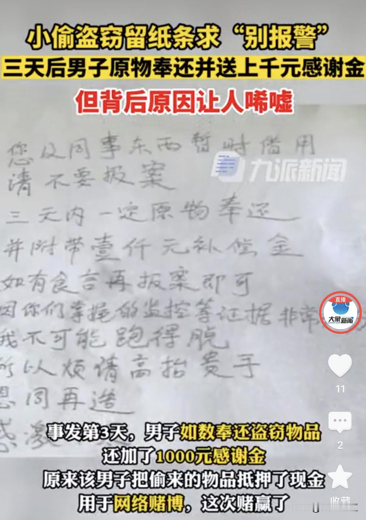 重庆,一男子跑进了一家公司拿了一些财物,临走时,男子还留下纸条表示三天内一定原物奉还,如有食言在报警不迟。三天后,男子果然兑现承诺如数奉还了财物,还多加了1000元,结果男子还是被拘留了。 据悉,男子周某在某企业担任法务高管,可是却染上了赌博的恶习,平时的工资根本不够赌,于是,周某便惦记上了周边的一些公司。 趁着深夜,周某潜入到一家公司后,带走了一些财物。临走的时候,周某还写了一张纸条,表示自己只是借用,不要报警,三天内一定如数奉还,如果食言再报警不迟。 三天后,周某果然兑现了承诺,将原物奉还,还额外给了1000元酬劳,但是,周某还是被警方抓获归案,因为失主选择了谅解周某,所以,周某并未被刑拘,而是被取保了。 奈何周某还不收手,再次作案后被警方给拘留了。据周某表示,自己偷来的财物抵押之后去赌博了,因为赌赢了,所以就能还上原物以及额外给1000元报酬了。 有人说,这个失主也是没意思,人家都说好三天内归还,还额外给了1000元,这报警抓人家干什么? 也有人反驳,这个人是赌博赢了,如果输了呢,拿走人家工作电脑的话,不要说三天返还了,就是一刻也等不了。 所谓的盗窃,就是将失主的财物,以秘密窃取的方式占为己有,并脱离失主的掌控。 本案中,周某留下纸条表示暂时借用,但是,借用是要征得财物所有人的同意的,在财务所有人没有同意的前提下,擅自取走后表示暂时借用,都不影响定性。因为从拿走的那一刻起,就是非法占有了。 所以,男子的行为被定性为盗窃没有疑问,只不过,如果盗窃数额达到刑事处罚标准,对此就要按照盗窃罪立案处罚了,按照刑法的规定,盗窃数额较大的,处三年以下有期徒刑,管制或者是拘役。 本案中,显然男子要面临3年以下有期徒刑的处罚,因为有失主谅解,加上财物也如数归还,所以,男子的行为并不算恶劣,所以被采取了取保候审。 可是,周某在取保之后又继续实施新的犯罪,那么取保候审就不再适用了,只能将其收监处理。 也有人说,要是我肯定不会报警,沟通的方式有讲究,只要是真名实姓,如真的不还也不会报警,就凭这份诚信下的无奈,就权当钱是自己不小心丢了,小偷也没想到,本想诚信会换来一点点的恻隐之心,没想到,诚信反添了失望和无奈。 对此,你对本案有什么看法? —————————— 关注我,带你评析法律热点,关注冷暖人生。 文章原创,抄袭必究