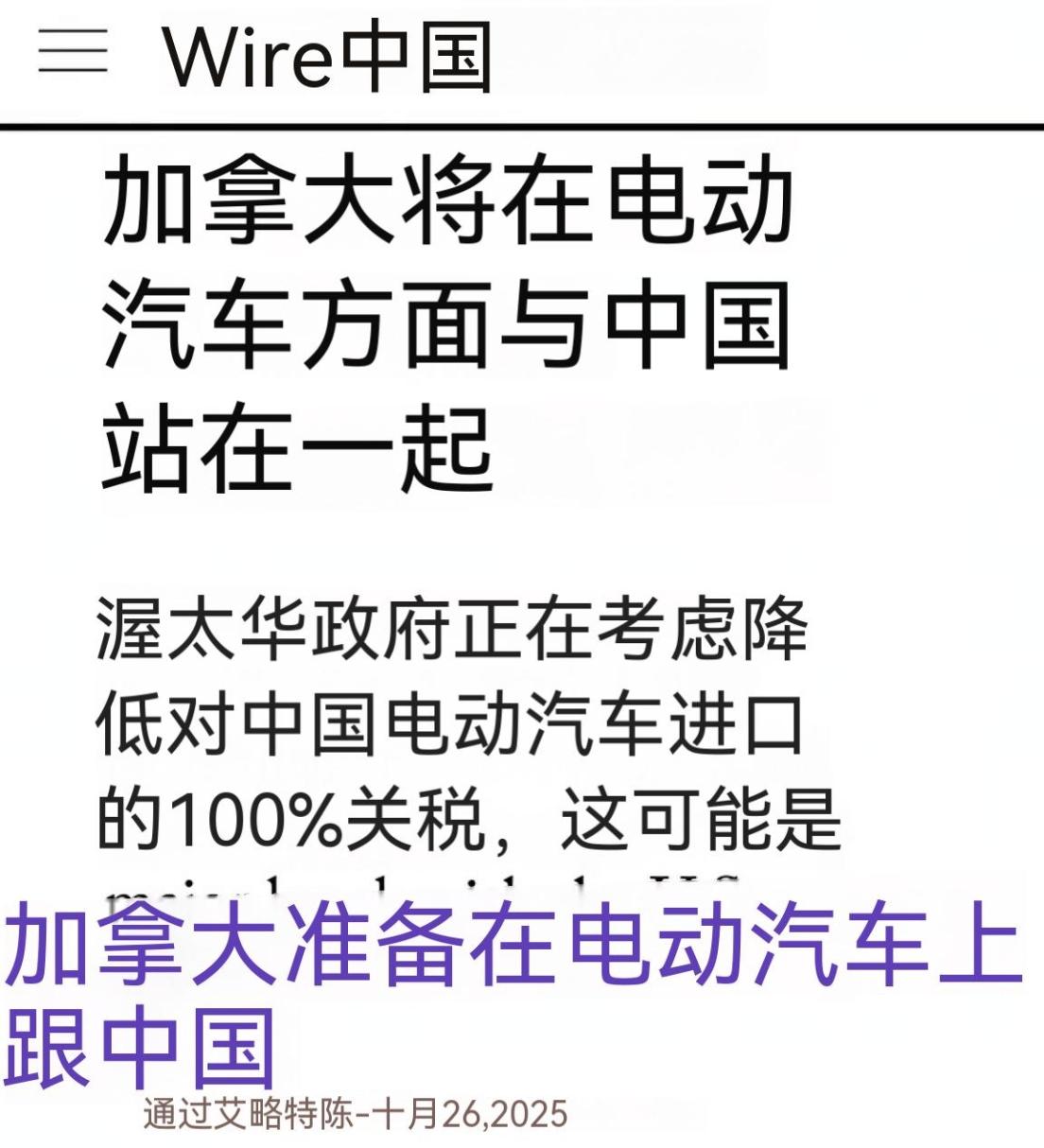 果然能在地球上混的,没有傻子。 你实力的多与少,别人心里非常清楚。 加拿大这是一看老美想动真格的, 立刻毫不犹豫的搬出了中国。 直接放风要把中国的电动汽车的关税直接降下来。 这就是加拿大的策略,因为只有中国才能刺激老美。 提别人都没有这个好用。[捂脸][捂脸]
