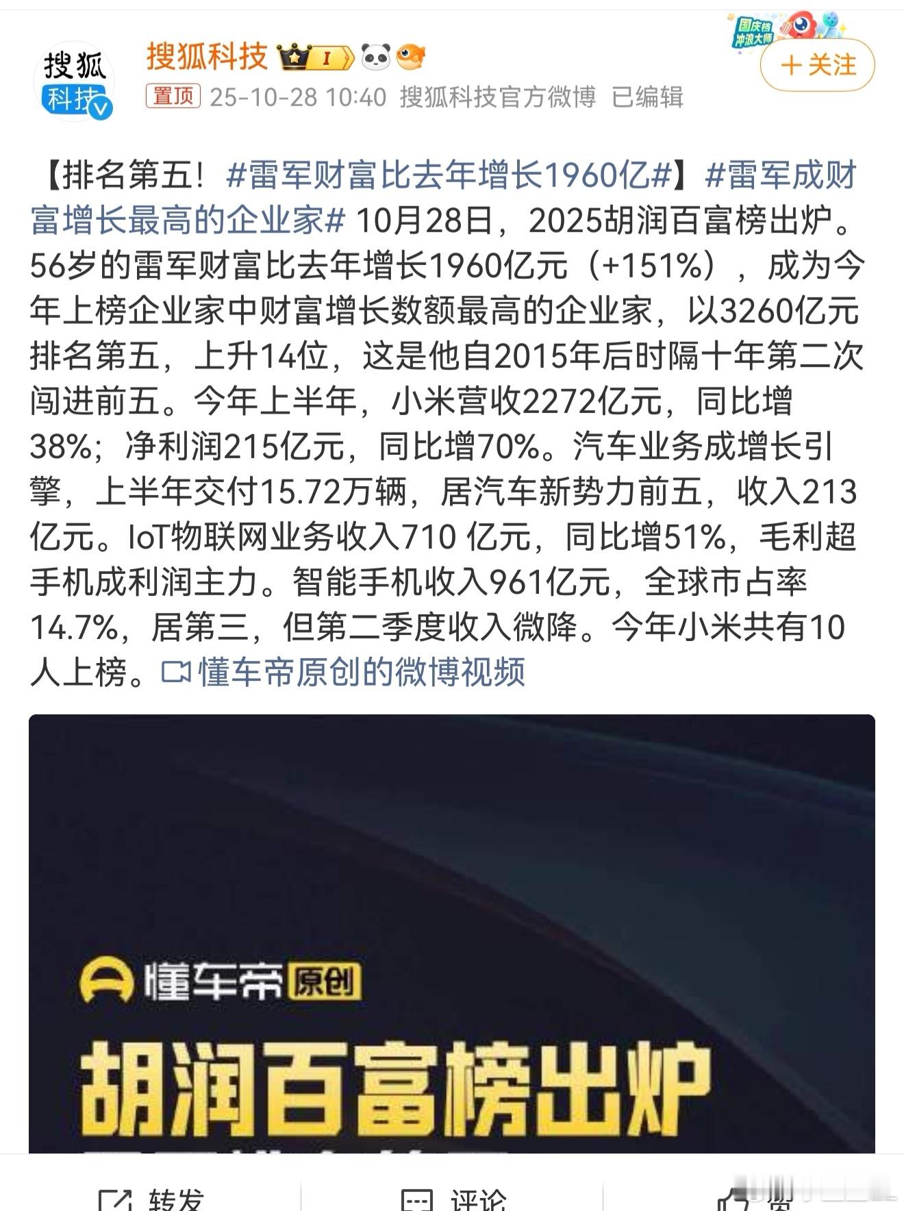 雷军财富比去年增长1960亿 雷军成财富增长最高的企业家