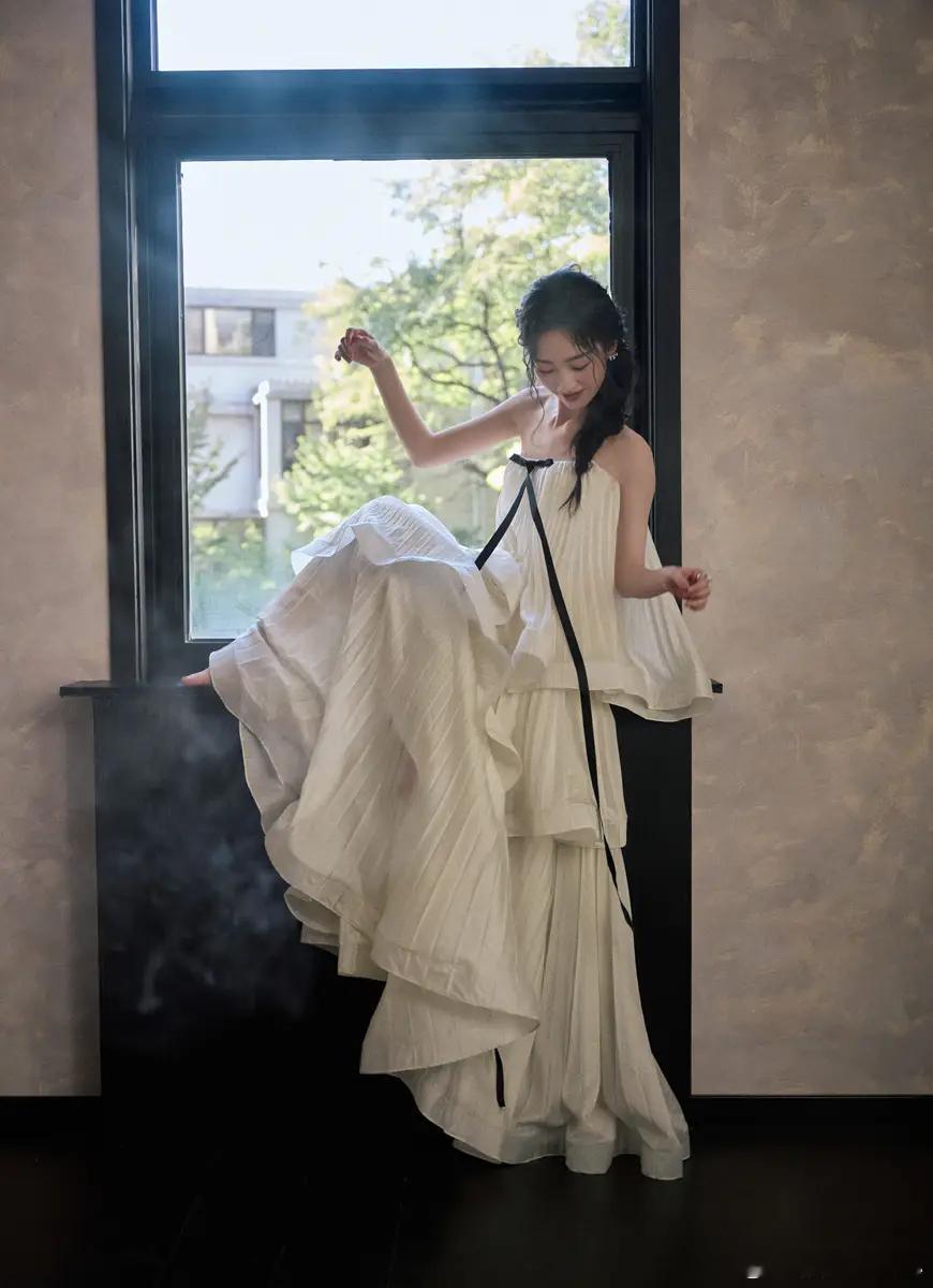 10月28日,邓恩熙的一组盛典造型释出。图中,她穿着白色抹胸长裙,倚在窗边,优雅灵动。