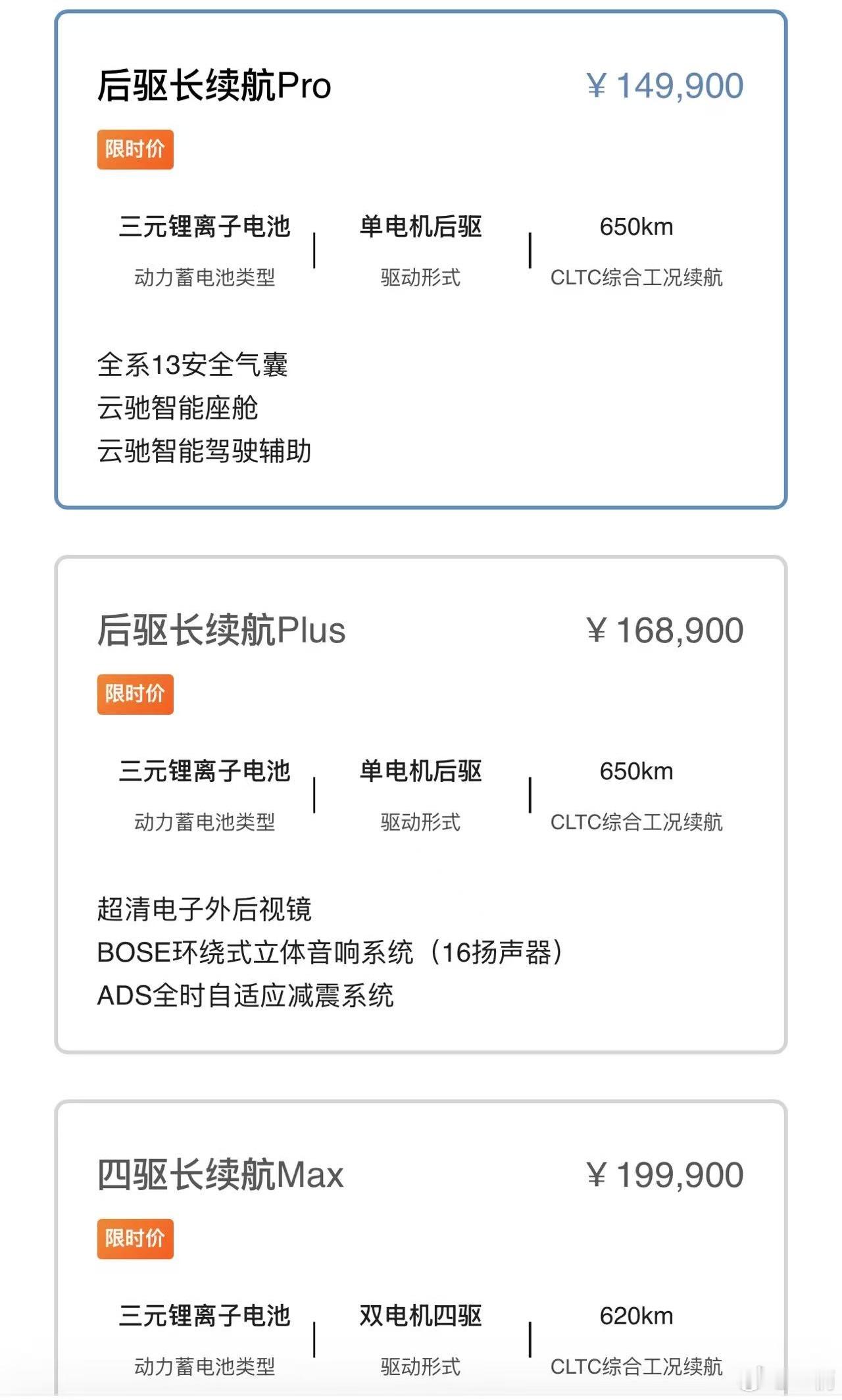 有650公里续航,后驱200kW大电机,标配了13个安全气囊~