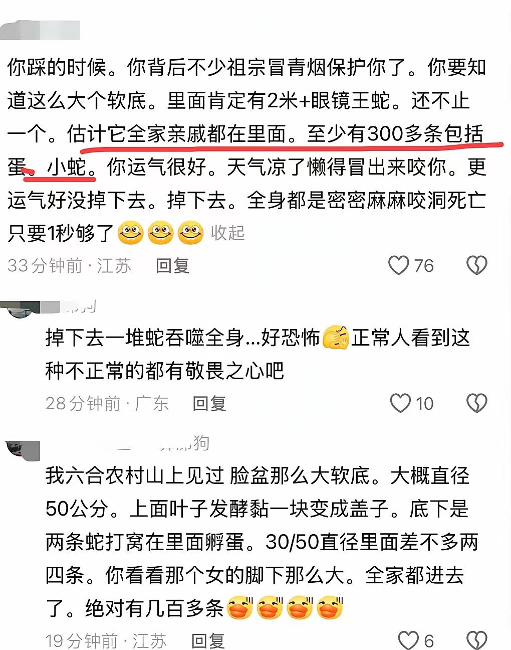 看得头皮发麻! 女孩在眼镜王蛇的窝上蹦跶, 以为是天然的蹦床,没想到突然 蹦出来两条蛇后吓得边叫边跑。 事情是这样的,女孩和朋友徒步到云南普洱的山林里玩耍,路过一处丛林时,女孩踩着一土堆蹦跶,边蹦边跟同伴笑:“这天然蹦床好软!” 还让同伴给她录视频,结果没蹦几下下,土堆里“噌”地窜出两条胳膊粗的长虫,吓得她尖叫着往一边跑,连掉在地上的手机都忘了捡。 等了好一会儿俩人才小心翼翼回去捡手机,事后女孩把视频发网上,才知道自己踩了眼镜蛇窝。有网友调侃到:“你跳的时候你先人都踢你冒冷汗,这是耗了多少功力才保下你。” 其实是这个季节蛇开始冬眠了,蛇类活动变缓,加上女孩蹦跶时没直接踩到蛇身,两条蛇刚睡醒没力气,估计才没追上去。不然眼镜王蛇多狠啊,一口毒液能毒死20个成年人,还特护崽,谁靠近窝就追着咬。真是她先人保佑她了。 玩笑归玩笑,但是咱们还是要有点生活常识,不能出门就瞎搞,不然受伤的还是自己。进山林里蛇窝多,尤其是这种半埋在落叶里的土堆,看着像杂物堆,其实是蛇用来孵蛋的“育儿房”,像有村民误踩蛇窝,被咬伤后送医抢救的事多了去了。 所以进山注意这几点,别踩不明土堆和落叶堆,这些地方最容易藏蛇;看到黑底白纹、头部呈三角形的蛇,不管是不是眼镜王蛇,都赶紧跑;最好带个长棍,走几步就打打前面的草。打草惊蛇不是瞎说,古人诚不欺我,确实能提前把蛇惊走。可偏偏有人觉得“蛇怕人”,心存侥幸,最后把自己置于危险中。 和野生动物打交道,别靠运气靠常识。天气帮忙、蛇没发力只是偶然,真要是撞上活跃期的眼镜王蛇,再后悔可就来不及了。毕竟,能活着从蛇窝边跑下来,靠的不是“祖宗保佑”,而是刚好赶上蛇没状态——这种运气,没人敢赌第二次。 这运气算好,可能真如网友说的,先人保佑。各位读者你们怎么看?欢迎在评论区讨论。
