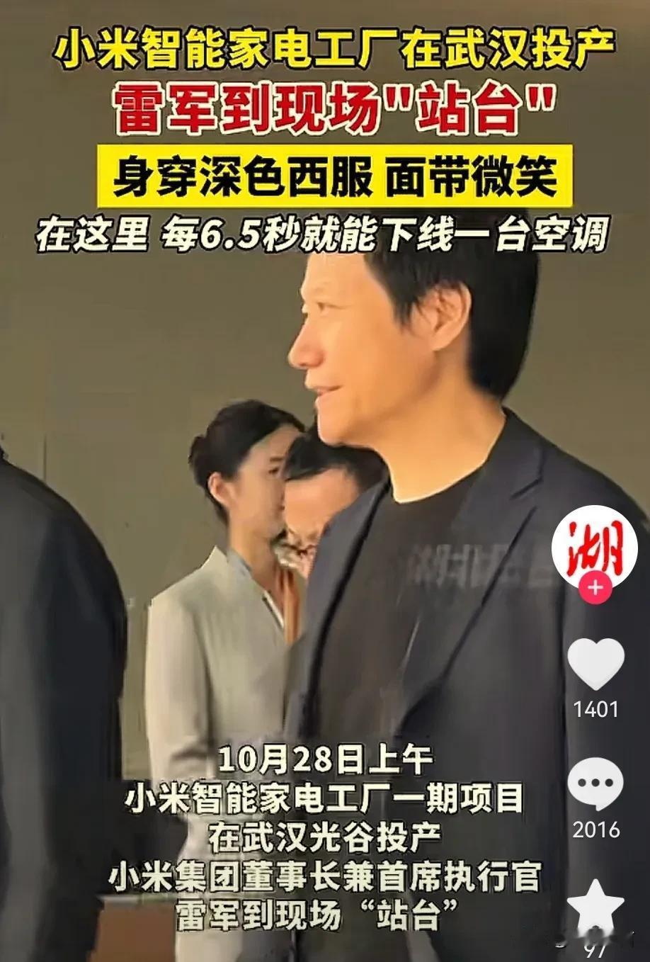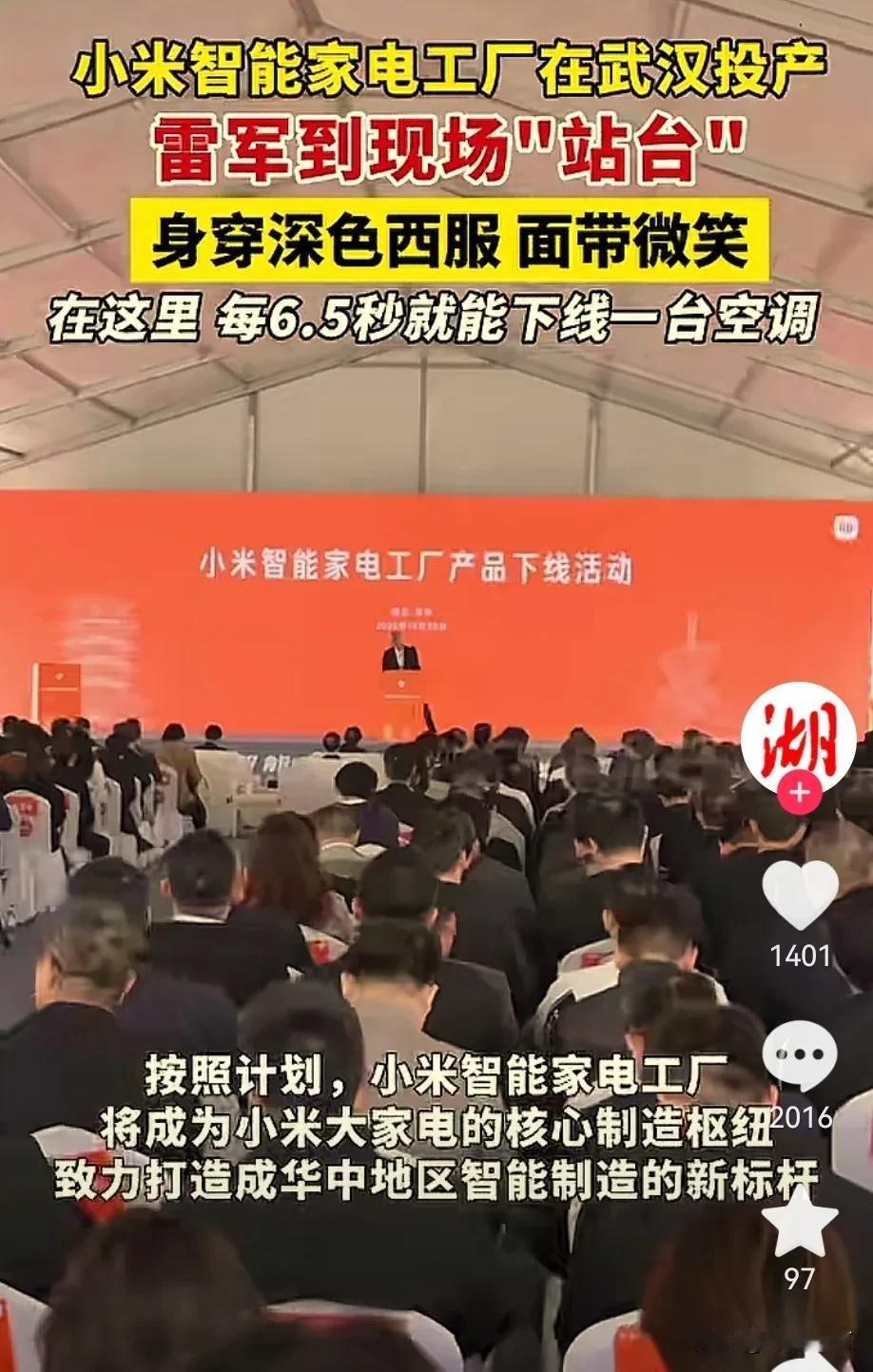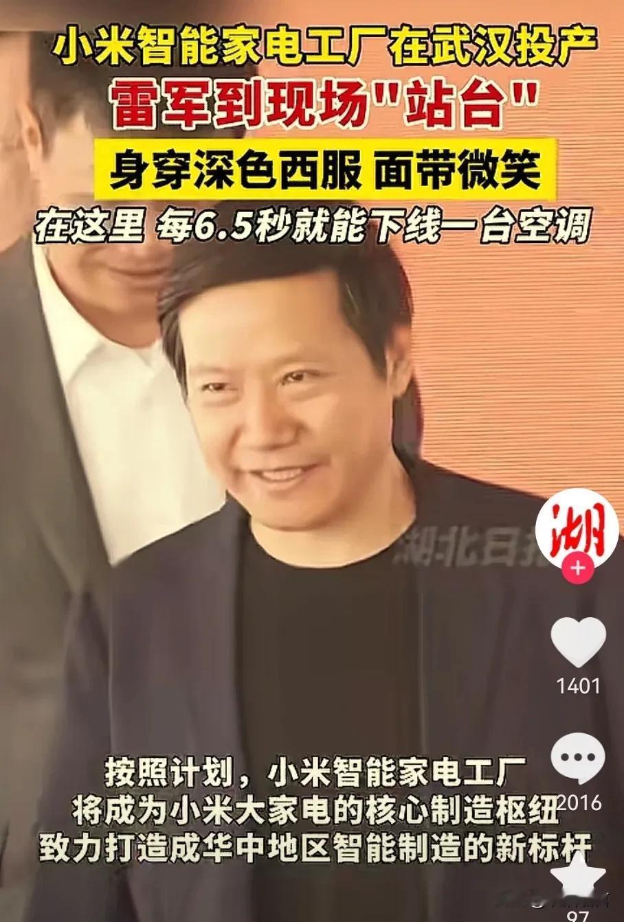 小米雷总又上头条了! 小米在武汉家电智能工厂在武汉投入使用,雷军参加了活动并发表讲话,有几点值得思考: 首先说明小米慢慢开始自己生产产品了,减少代工厂 ,这样可以提供产品质量。 其次就是产能提上去了,每6.5秒生产一部空调,应该还要注意产品质量,就完美了! 最后就是希望小米说到做到,让每个小米用户体验感越来越好,减少一些营销过多的地方,让小米走得更远! 小米雷语 雷军