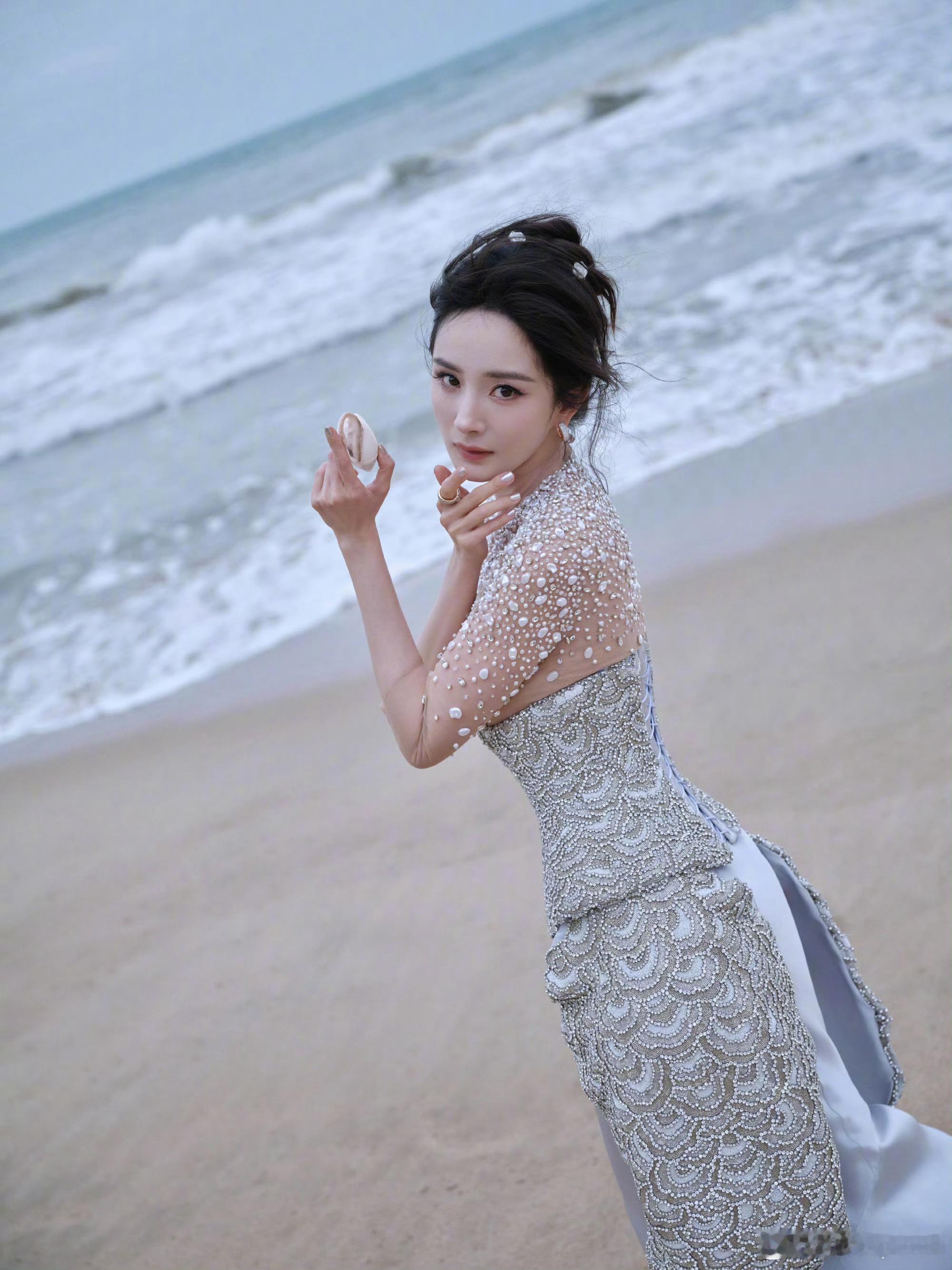 执海螺轻贴耳畔,发丝随海风轻扬,眉眼间漫着清柔,杨幂莫不是海的女儿吧!