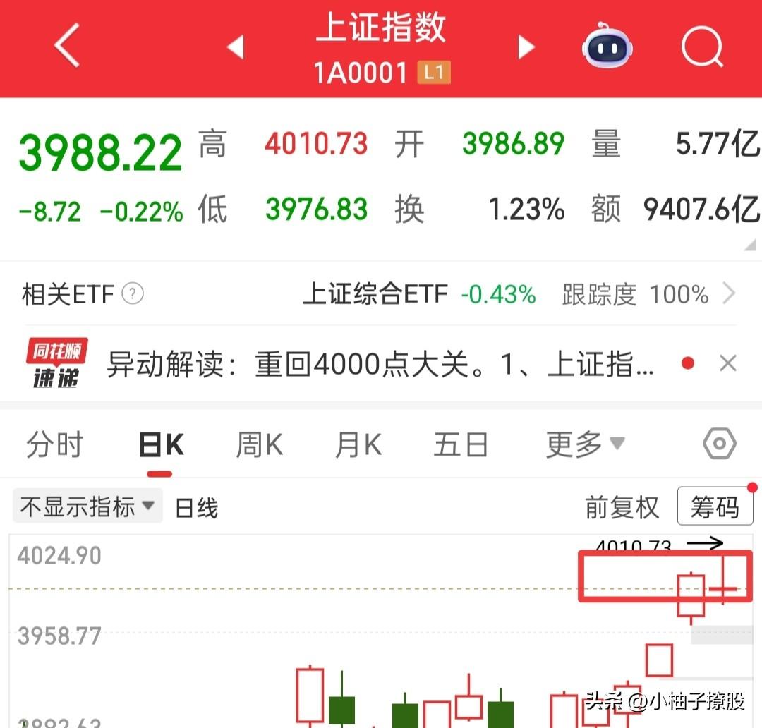 不用纠结明天的行情,明天其实很简单,比如今天跳水你拿货了,那么明天只要不放量拉升,那就撤退! 今天的十字星并不是见顶信号,见顶十字星和它一点也不搭边,今天的十字星只是一根上涨中枢,这种形态出现在个股上,大多数次日都是低开高走的阳线! 阳线分强弱,放量阳线,反包十字星就会继续开启上涨走势,缩量冲高的就是弱,这种基本没有格局的价值! 如果明天继续缩量,我们就看回补下方3950那个缺口,也就是周线那里的缺口! 我每天只分享短线思路,做中线的请忽略,不要盲目跟随,中线卧倒躺平就行,没有什么要说的!