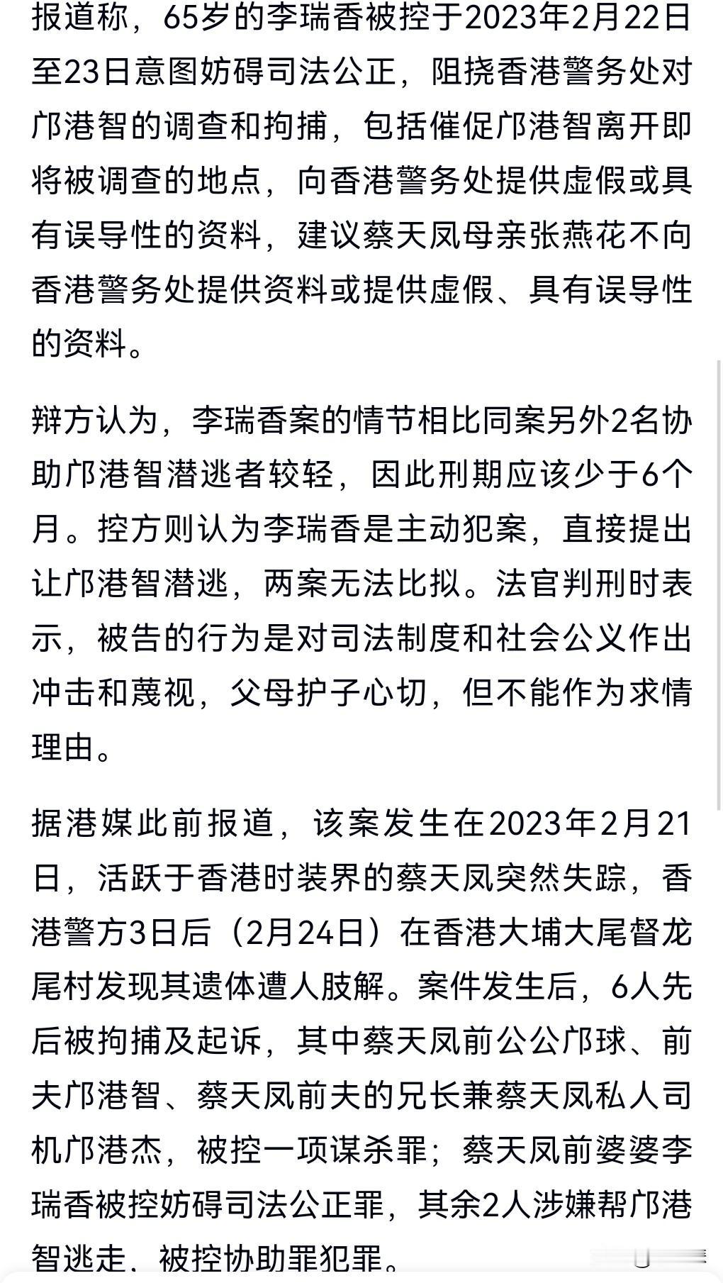 在法律面前,一定要做出正确的选择,不能够协助犯罪分子,哪怕这个人是自己的亲人,因为一旦被警方抓住,那自己也要受牵连。 名媛蔡天凤被害案迎来新进展,28日,蔡天凤的前婆婆因妨碍司法公正罪被判入狱18个月。 这真是敲响了警钟。 法律可不是儿戏。