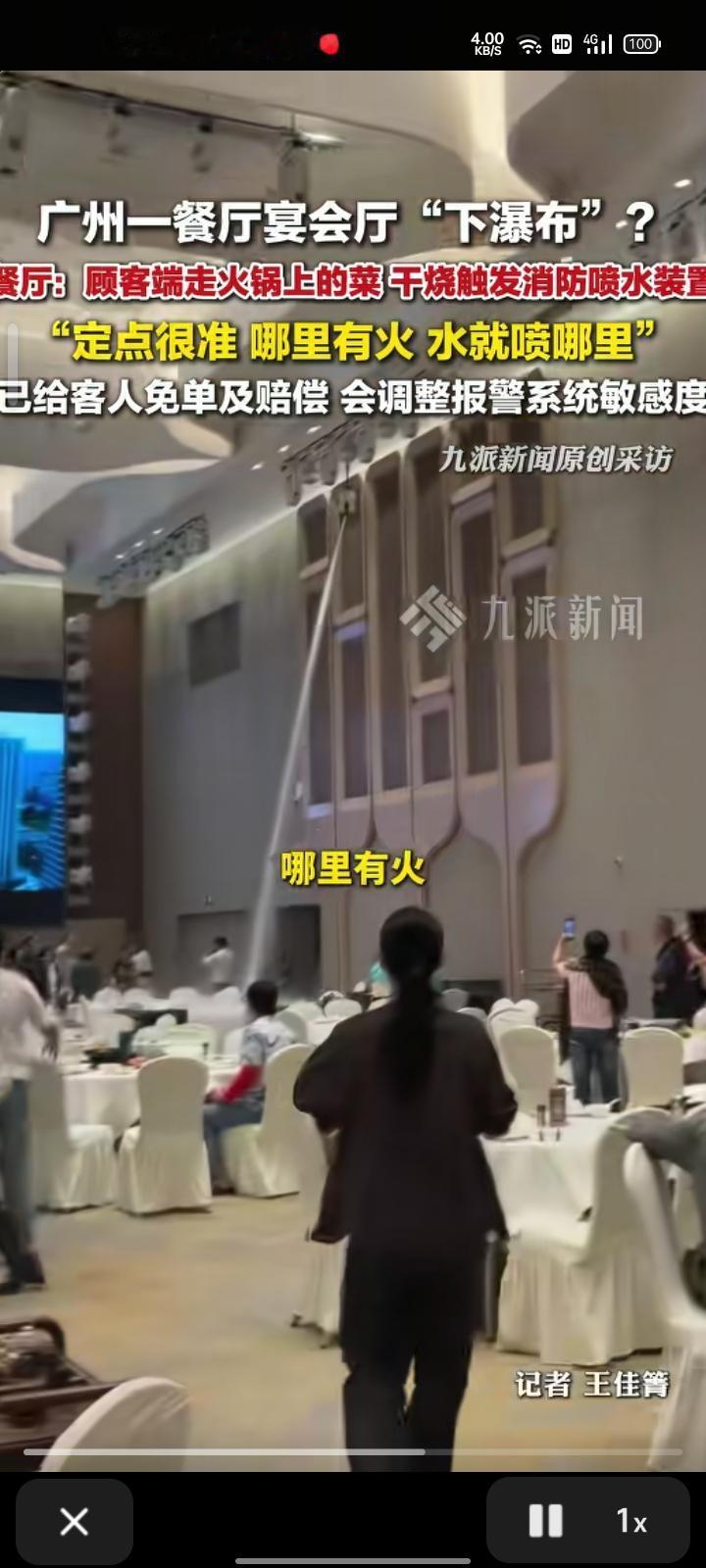 10月27日,广东广州。网友发视频称,在广州金塘胜宴吃饭时,墙上水管开始喷水,犹如瀑布一样,连桌上的菜都打飞了,附近的顾客纷纷避让。 工作人员透露,当时不少人在吃晚餐,有客人在烤羊肉串时忘记关火,烟雾一直往上冒,引发消防烟雾报警喷淋系统启动。餐厅当时进行妥善处理,无任何人员受伤,也及时对顾客进行安抚。 一个 “忘关火” 的小疏忽,直接引发了喷淋喷水、菜品打飞多重混乱。如果当时顾客多留意一下火源,或者餐厅提前对高油烟的用餐项目做些预警提醒,大概率能避免这场意外,但现实没有如果,以后注意就是。
