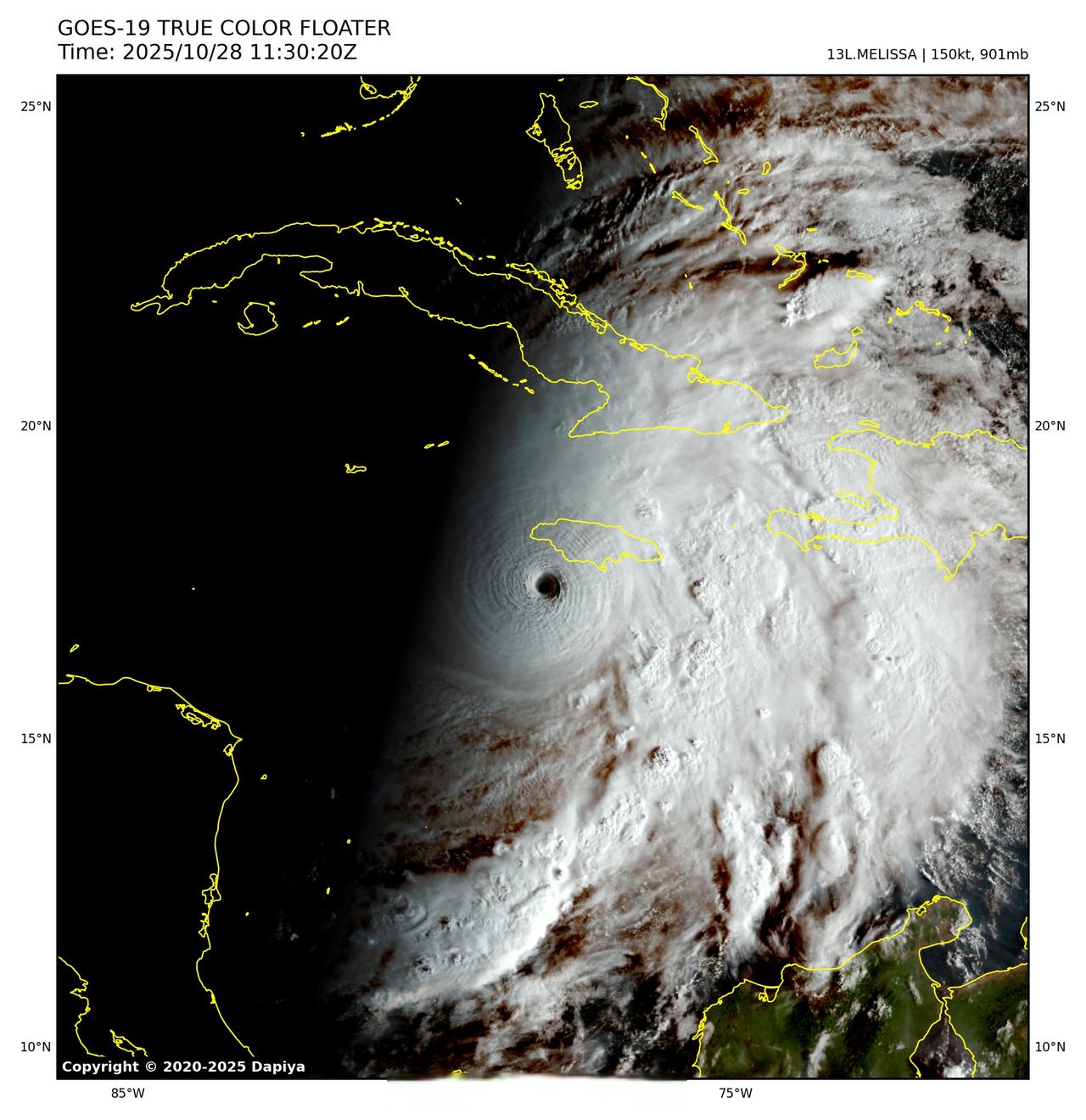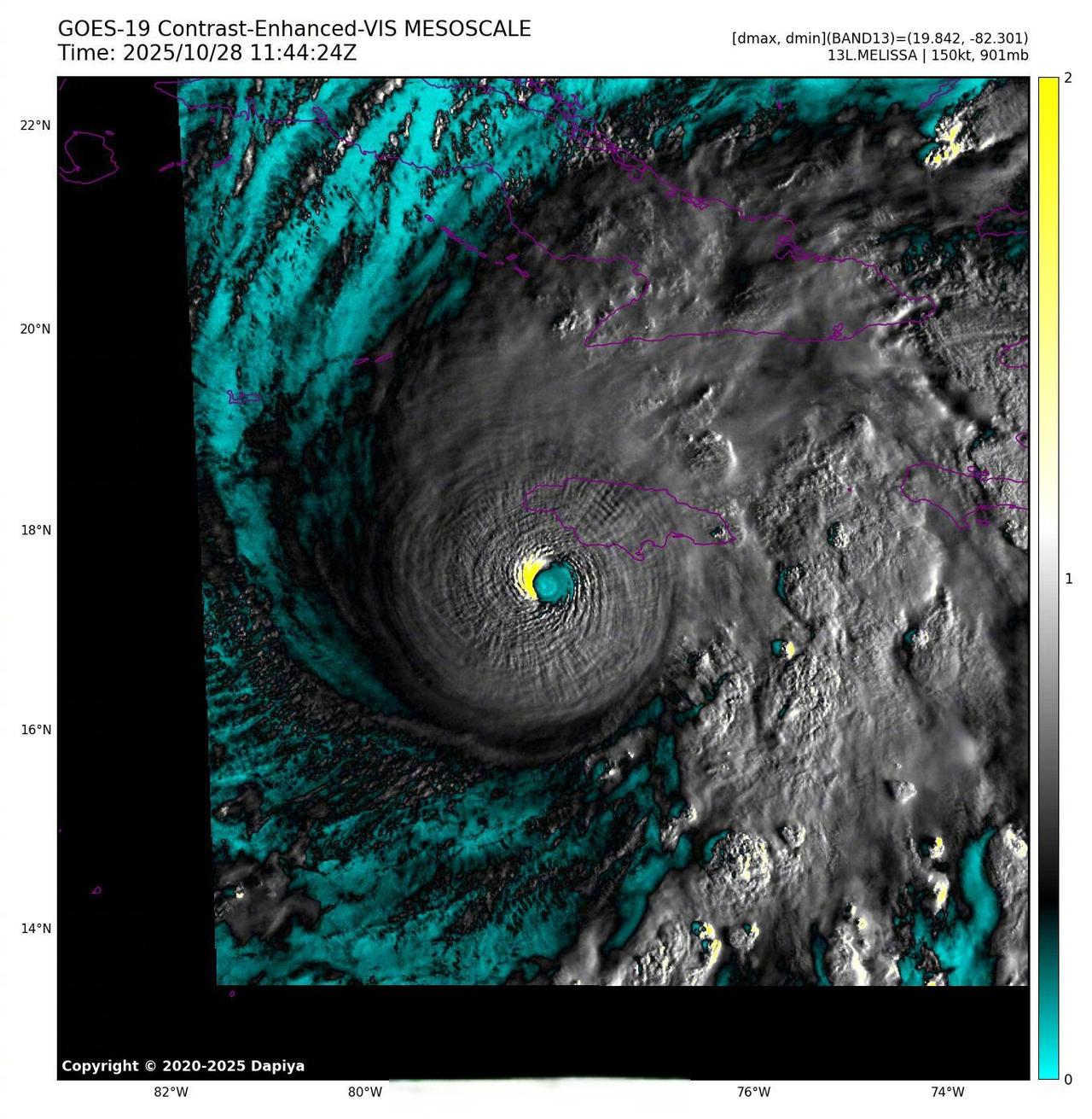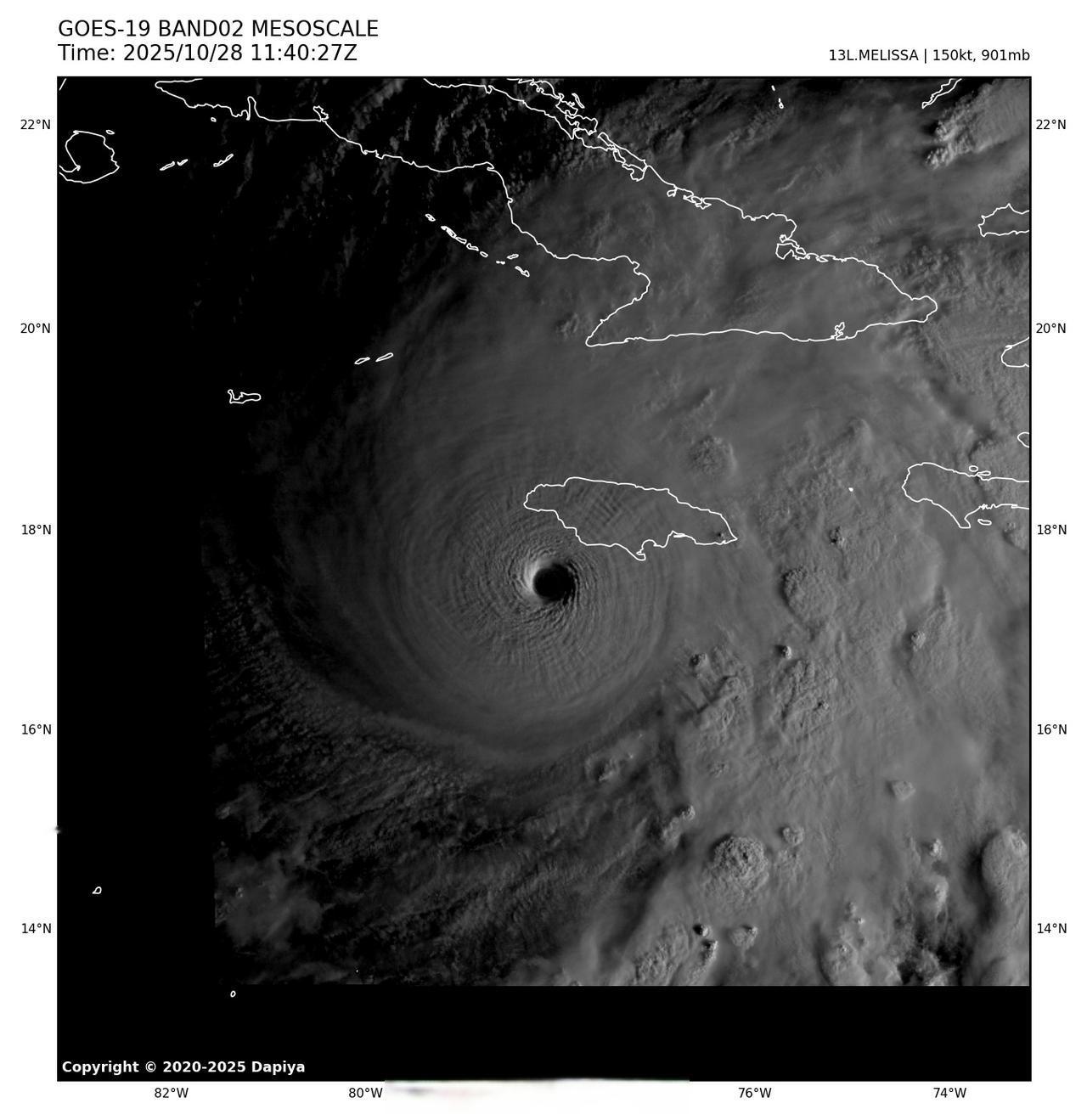 早安,牙买加!飓风梅利莎迎来登陆牙买加前最后一个日出,强悍风眼镶嵌在致密的核心之中,这将是载入北大西洋气象史的一刻!目前预计梅利莎几小时内就在牙买加岛西部沿海上岸,牙买加政府部门已经用“世纪风暴”来形容本次飓风,同时发布还巨灾预警,请在当地的华人同胞注意安全、及时躲入地势较高的坚固建筑内,飓风影响期间千万不要外出!