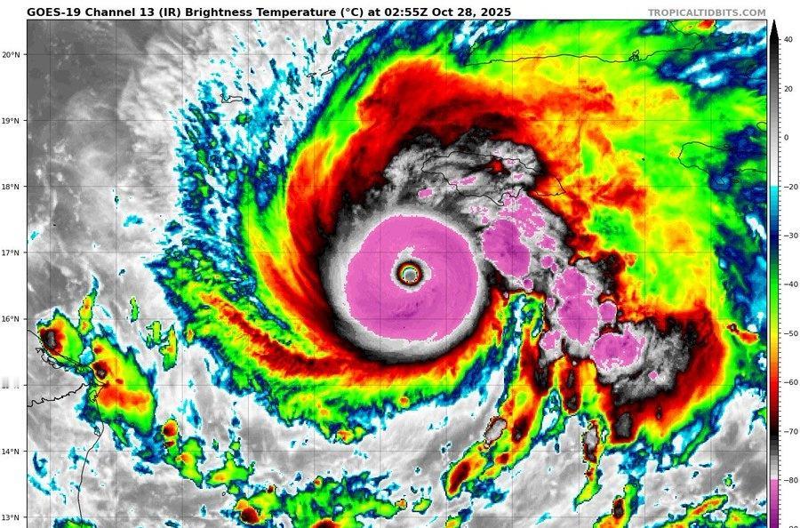 五级飓风梅丽莎现已开始向北转向牙买加方向移动,并持续增强。截至晚上11点的最新侦察显示,持续风速仍为每小时175英里(约280公里),但气压已降至903毫巴(约903毫巴),表明未来几个小时内将进一步增强,并可能于周二上午8点后某个时间登陆牙买加。 梅丽莎目前是2025年全球最强飓风,其气压是自1979年有记录以来大西洋所有风暴中第七低的。