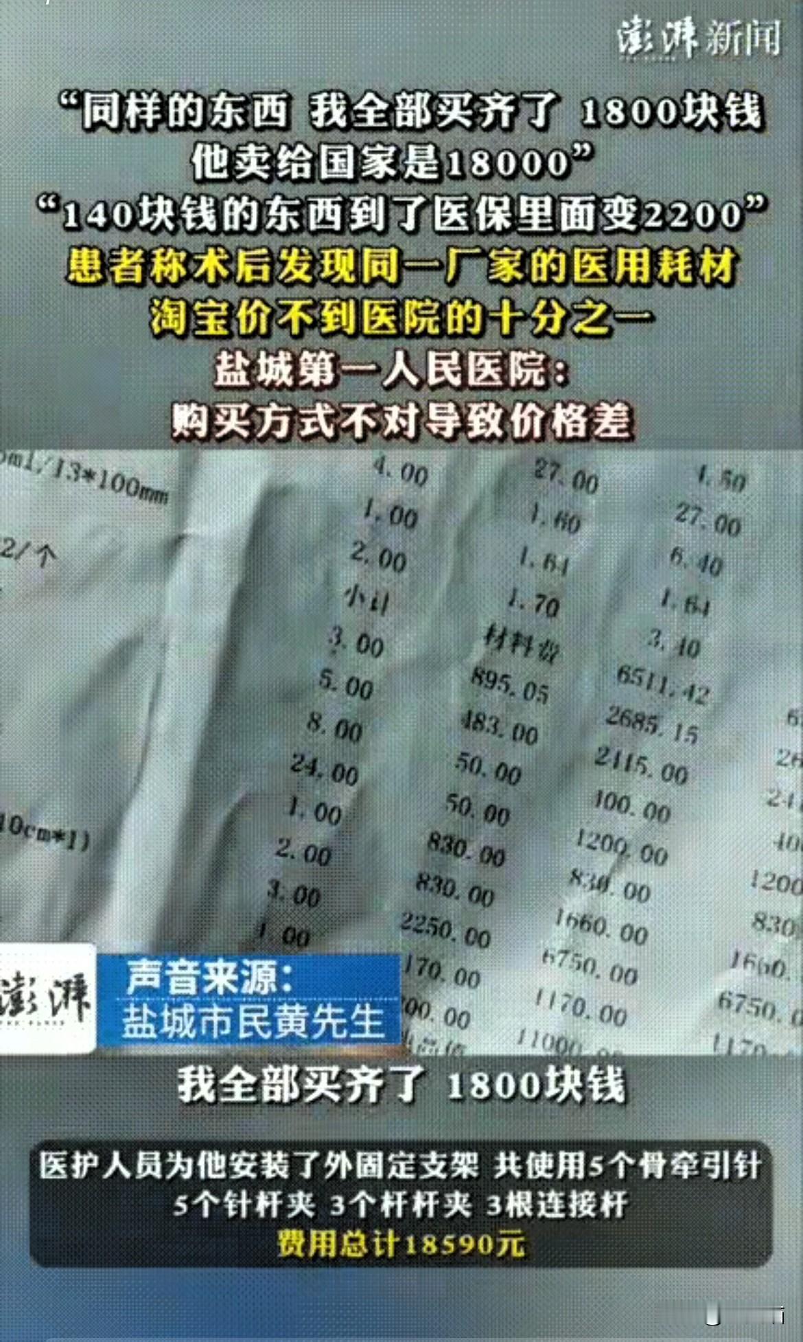 盐城男子术后刷淘宝,直接被医院耗材价气炸——42元的不锈钢骨牵引针收483元,168元的针杆夹卖2200元,差价足足十倍多。 医院说走的是“阳光采购”,价格由医保局定,可这“阳光”照不进账单有啥用?“阳光采购”就得全程透明,从出厂到使用的每笔加价都摆上台面,这才是对患者的尊重。