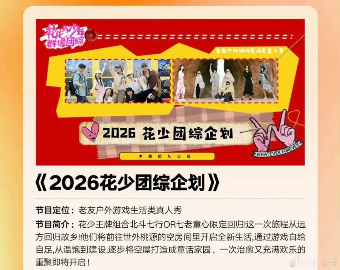 花少要拍团综了花少的北斗七行or七老童心将回归拍团综了!还是很期待啊!希望人都能齐了,想看看王安宇胡先煦和马思纯龚俊他们又能整些啥活哈哈哈哈!