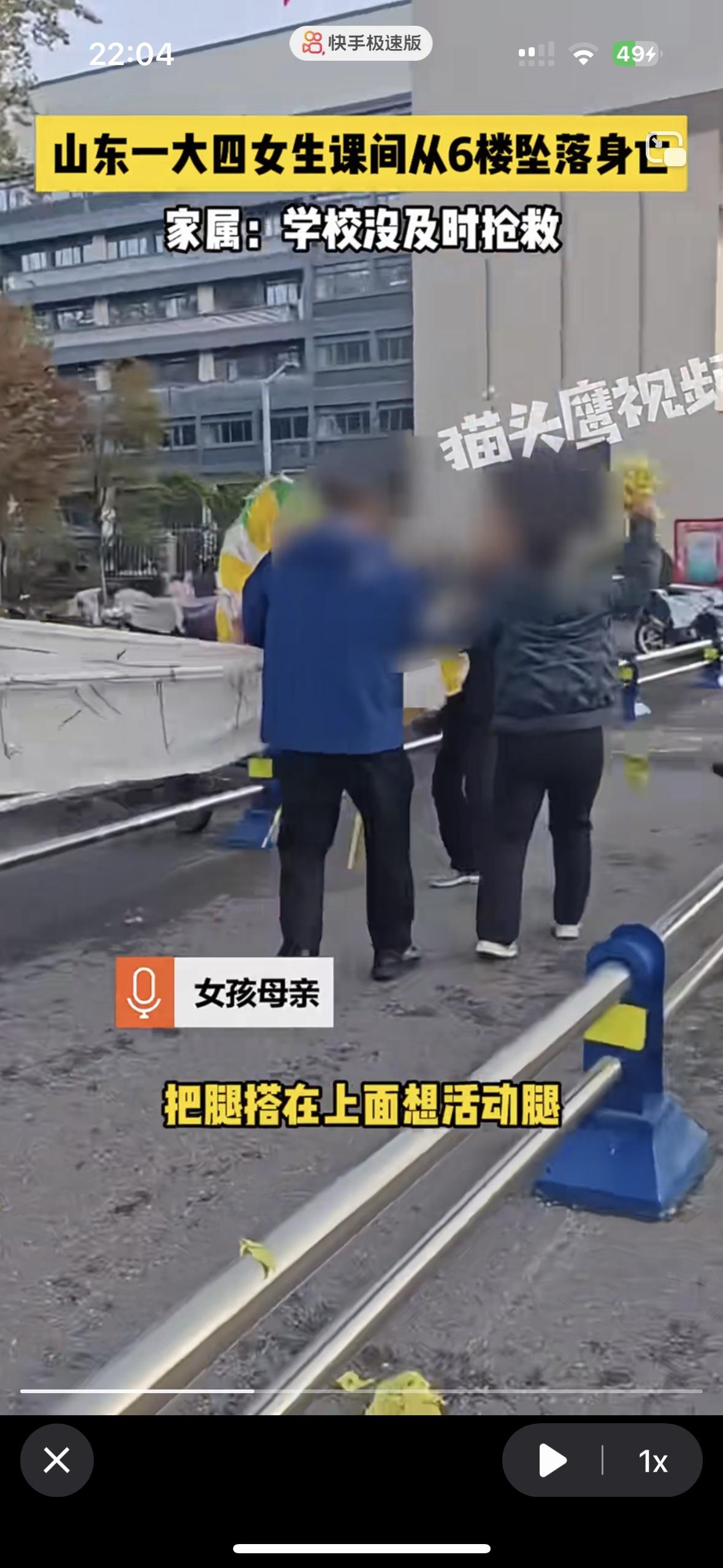 大四女生在学校坠楼身亡,学校却不及时抢救 到底谁在说谎?家长说自己女儿在烟台理工读书,女儿在课间坐在天台时间长了想活动活动腿,把腿搭在上面想活动一下,手抓着栏杆,不小心从6楼坠落 2个小时后才被学校发现了,随后报警,当时门岗就在出事地点20米处,学校一直安排家长住在宾馆,处理态度很差,想退学费和丧葬费,难道学校的安全措施不到位就没草菅人命吗?