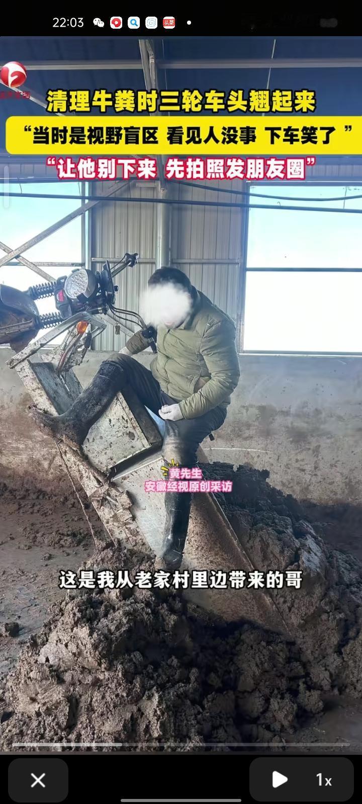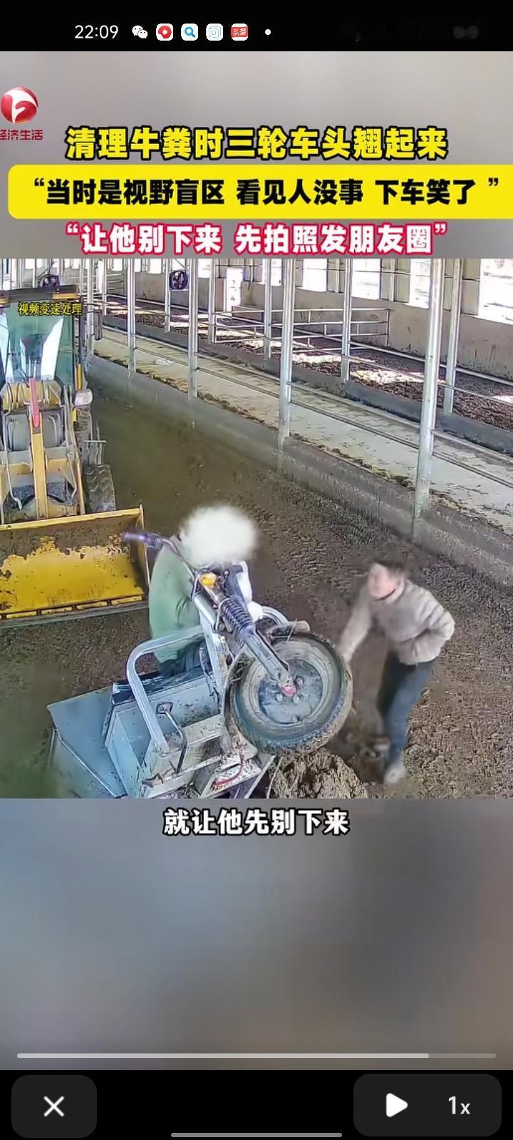 10月26日,吉林辽源。监控画面显示,男子开挖机清理牛粪,放在三轮车车厢,怕牛粪撒了就用铲子压一压,结果压得太狠导致三轮车车头翘起来了。事后,开挖机的男子见对方没事,下车笑了,然后拍照发个朋友圈。