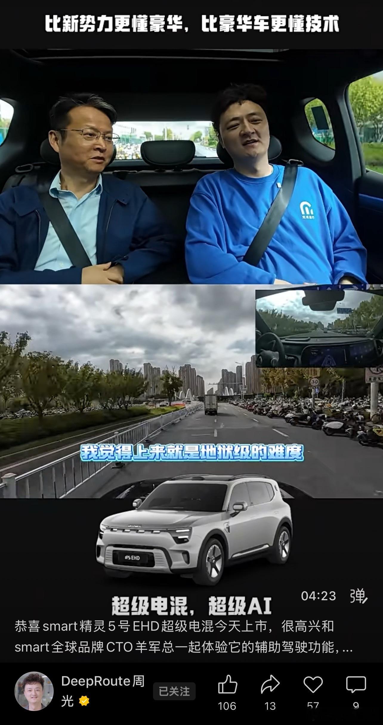 与元戎合作的智驾方案,搭载两颗Orin X + 激光雷达,支持全场景的高速城区智驾。元戎CEO周光和Smart CTO一起试驾,覆盖无保护左转、窄路会车、施工路段通行、非机动车混行等高难场景,实现“零接管”通关。