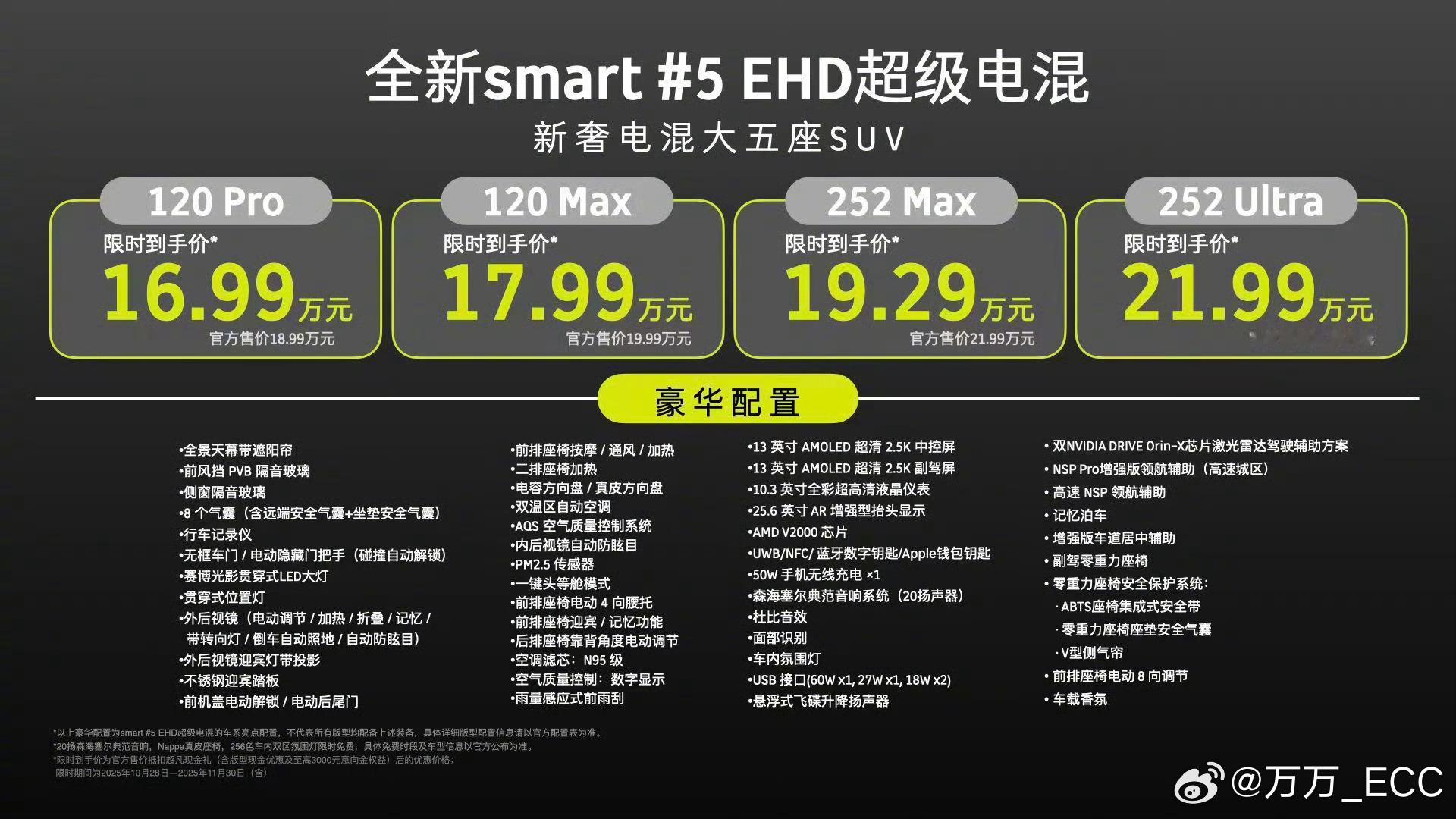 smart 精灵5号 EHD 超级电混正式上市,16.99 万起。现在的smart与其说是豪华品牌的子品牌,更像一个纯正的新势力品牌。