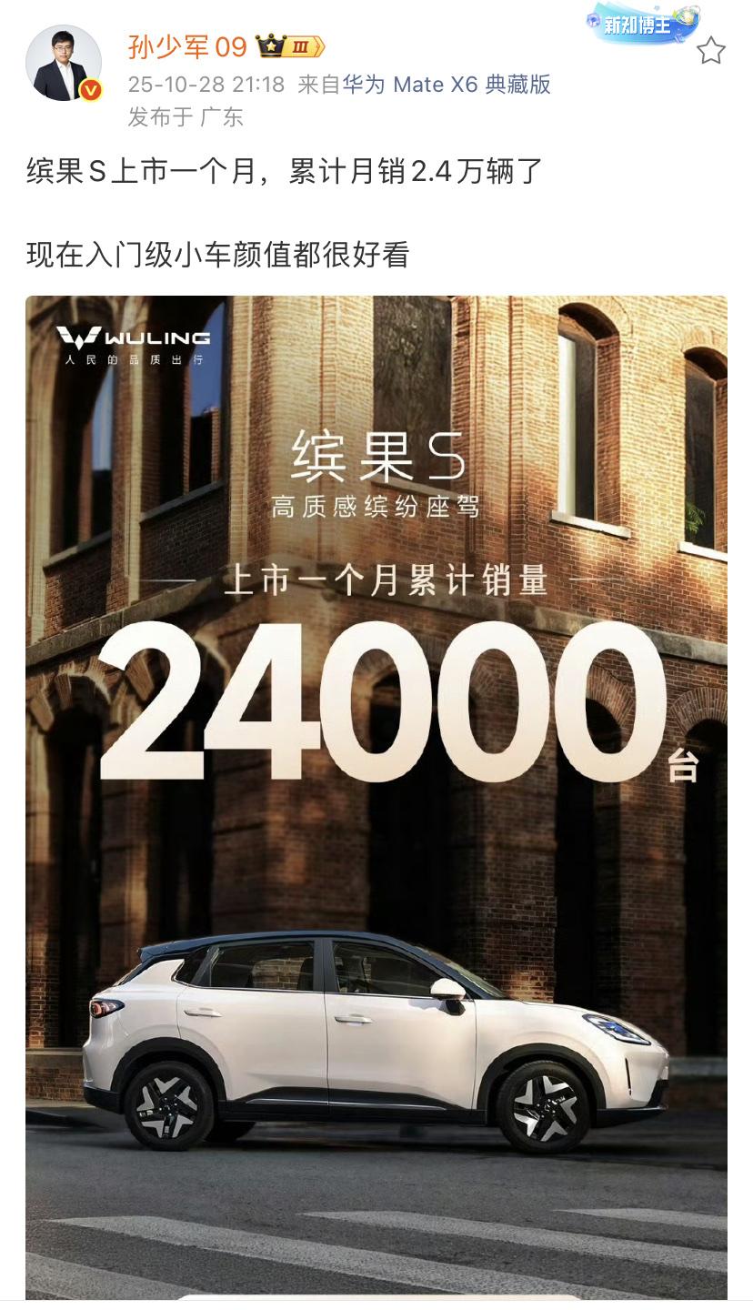 孙少军:缤果S上市一个月,累计月销2.4万辆了,现在入门级小车颜值都很好看! 2.4万辆的成绩证明消费者是非常喜欢这款车型的,不然也不可能卖掉这么多,而且五菱在10万元以下的市场占有率真的是相当的高。 特别是在下沉市场,五菱还有更多的开拓空间,如果能出一款小型suv,把价格控制在8万块钱以内,市场空间一定是更大的。
