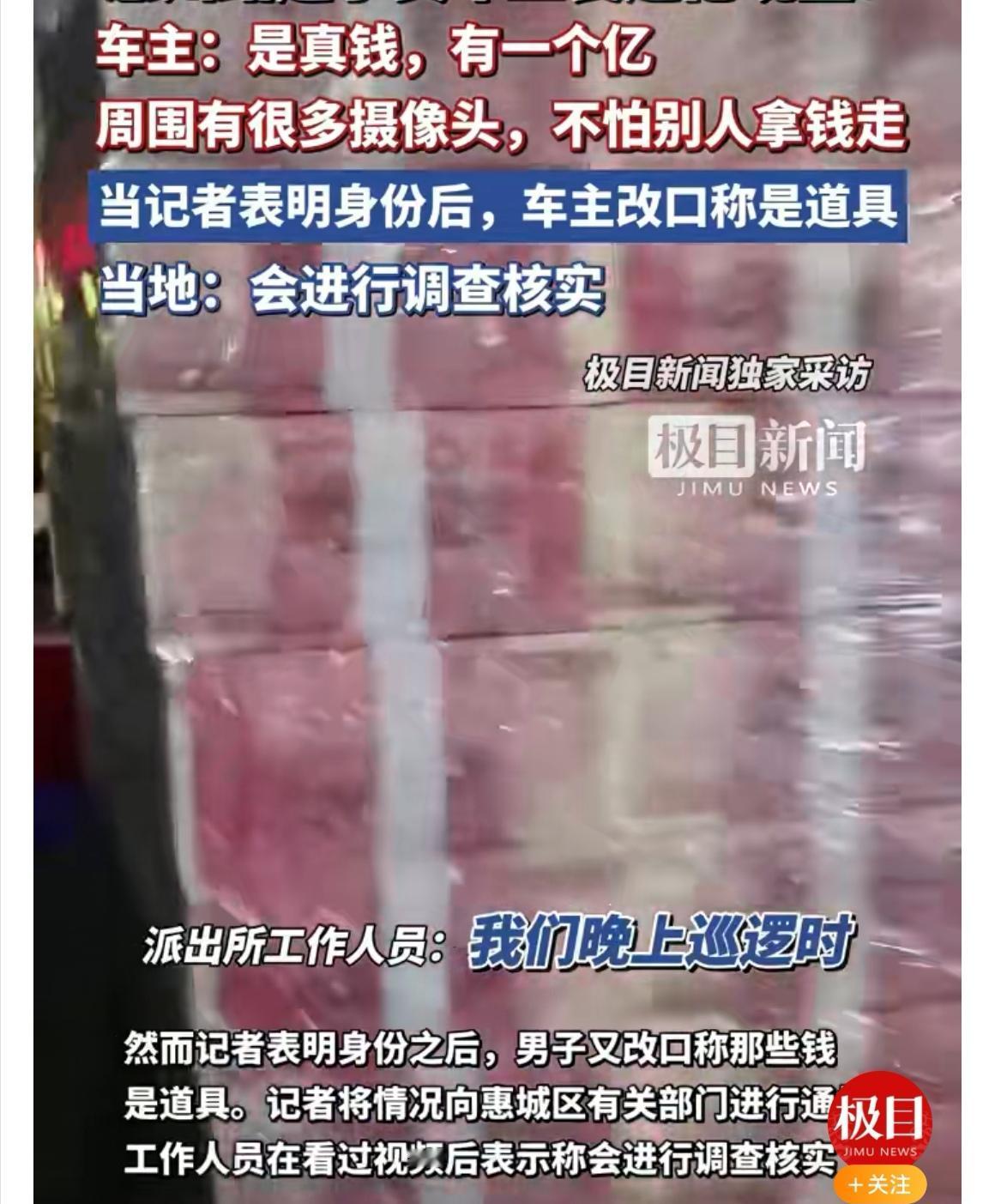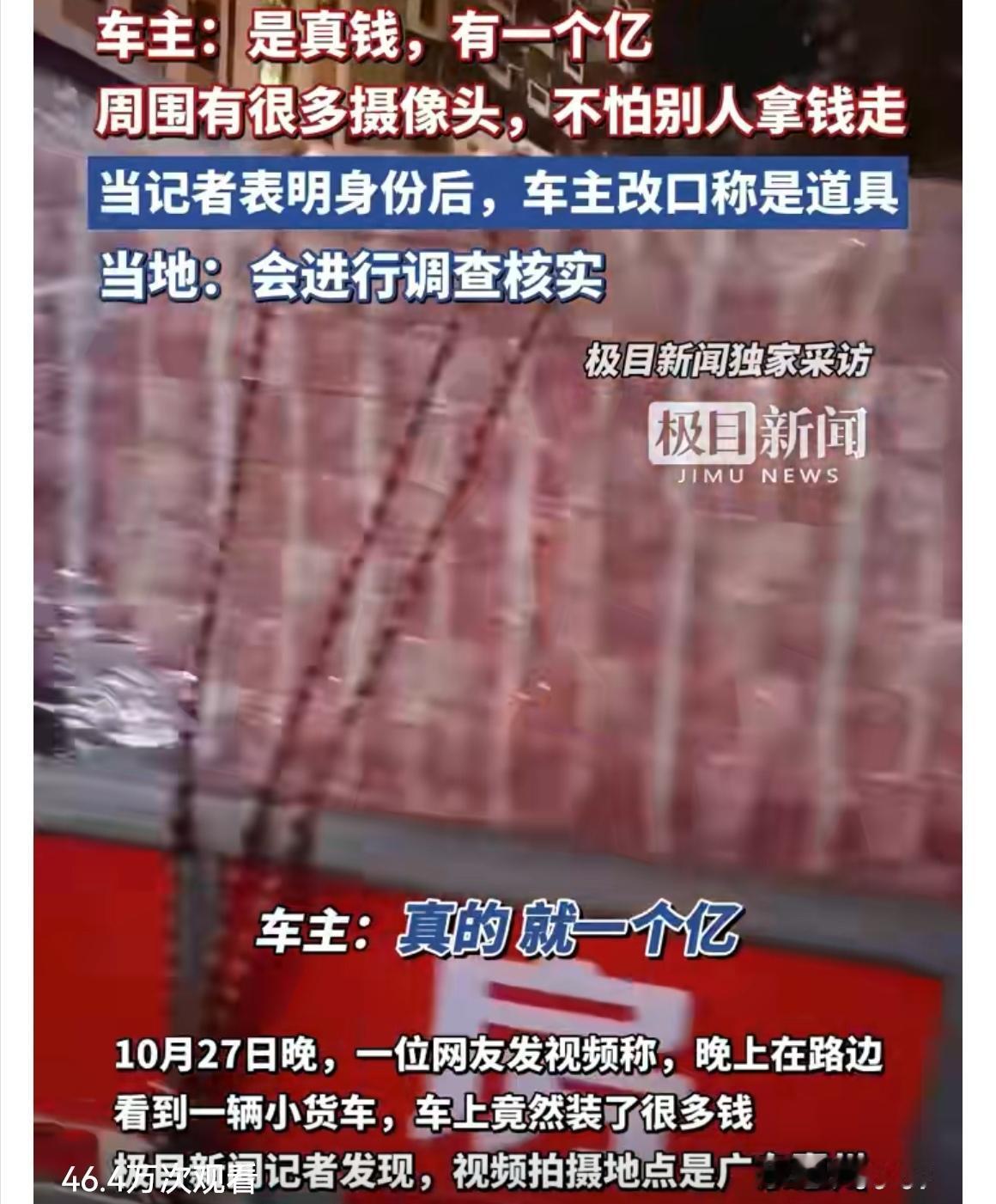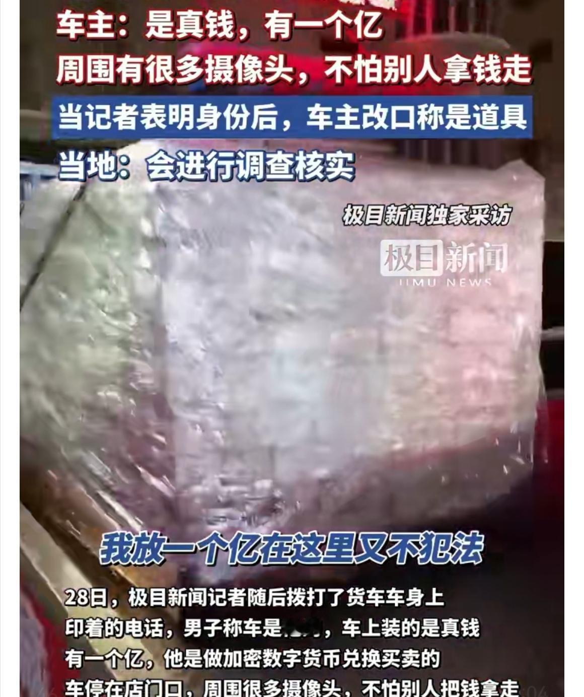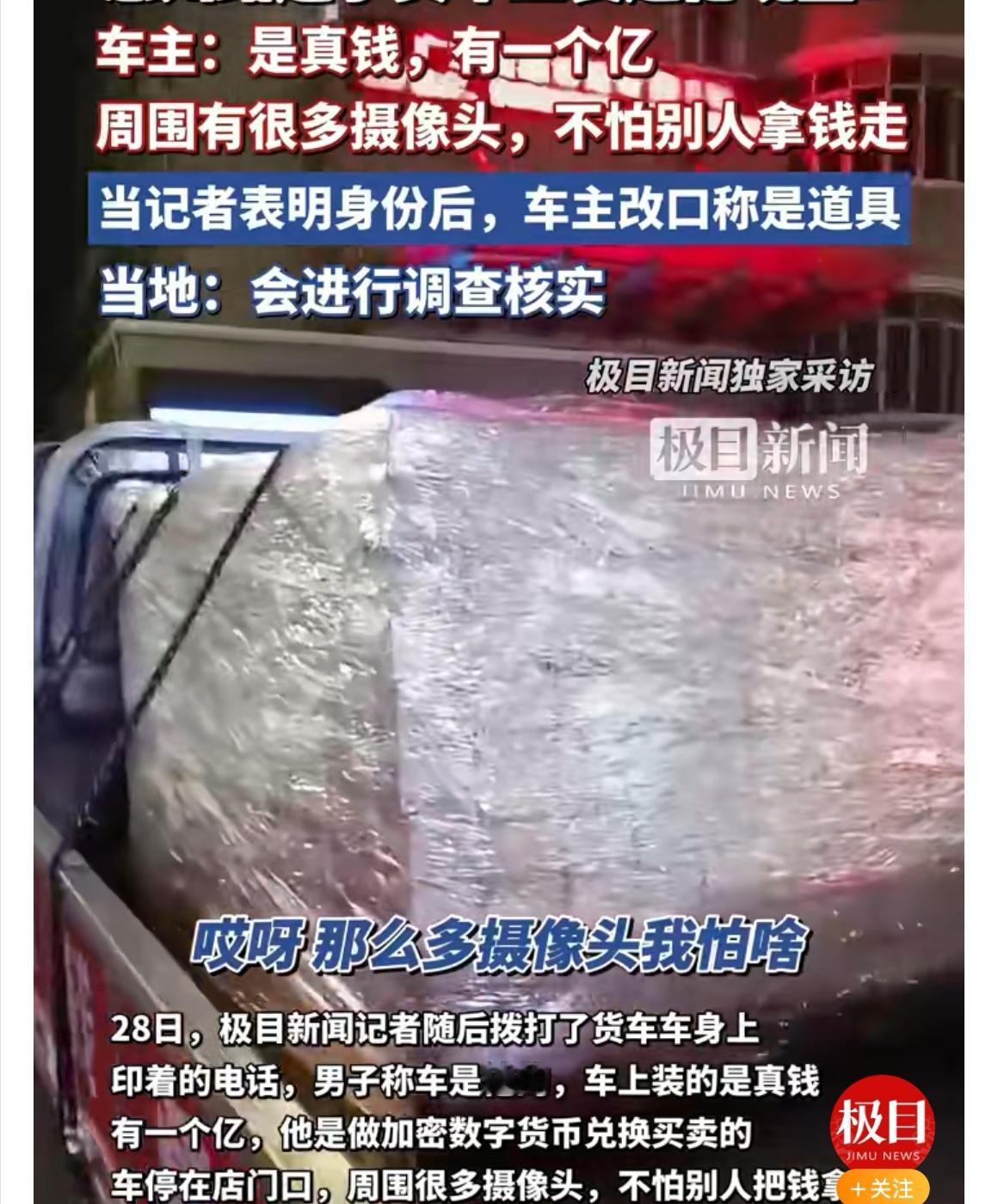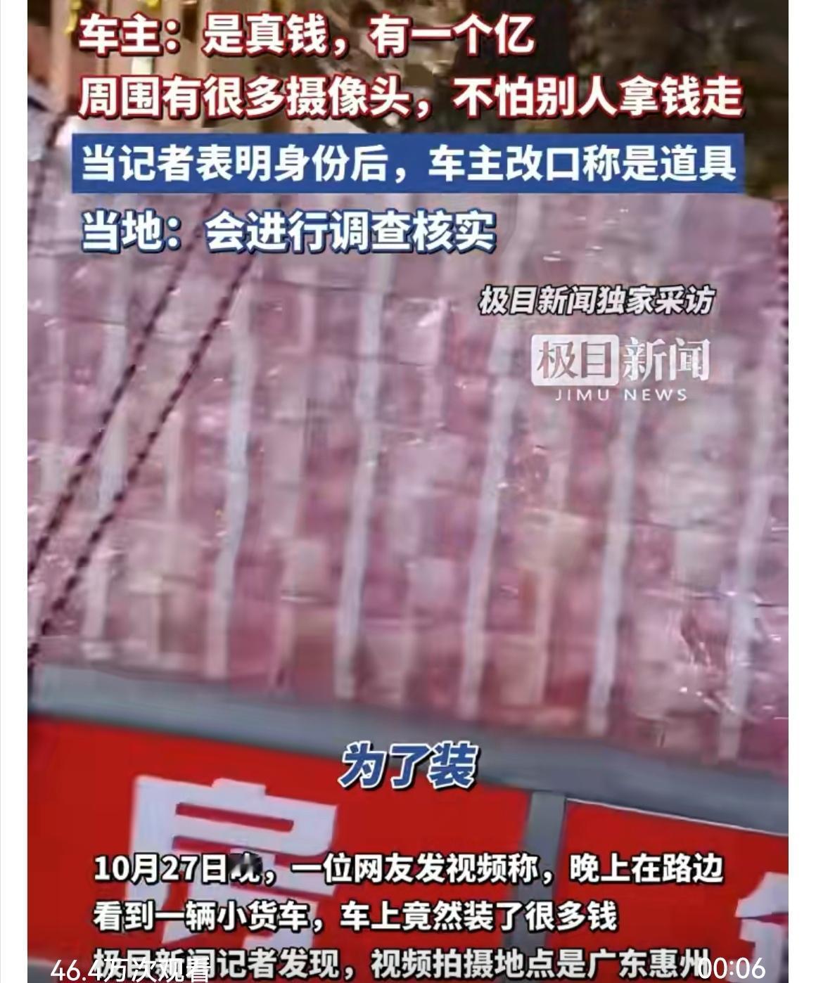 你能想象吗?在惠州的街头,竟然出现了这样一件奇事:一辆小货车,被指装着过亿现金!这到底是现实版的“财神降临”,还是一场精心策划的闹剧? 乍一听,过亿现金放在路边小货车上,简直不可思议。据极目新闻报道,10月27日晚,一位网友发视频称看到了这一奇特景象。记者拨打货车车身上印着的电话,男子先是称车上装的是真钱,自己是做加密数字货币兑换买卖的。可当记者表明身份后,他却突然改口说是道具。这前后的反差,实在让人摸不着头脑。 从常识来看,一亿元现金重约1.15吨,远超货车核载重量,且真钞运输需持人民银行批文并配备安保。很明显,男子最初的说法疑点重重。而他这种前后矛盾的说法,也不禁让人怀疑,这是不是一场为了博眼球的炒作。如今,当地部门已经介入调查,真相似乎正在一步步浮出水面。 无论最终调查结果如何,这件事都给我们提了个醒。在这个信息爆炸的时代,我们要保持理性和警惕,不要轻易被一些博眼球的信息所误导。同时,也希望类似的闹剧能少一些,让我们的生活多一些真实,少一些虚假的“流量陷阱”。相信当地部门会尽快查明真相,给公众一个满意的答复。