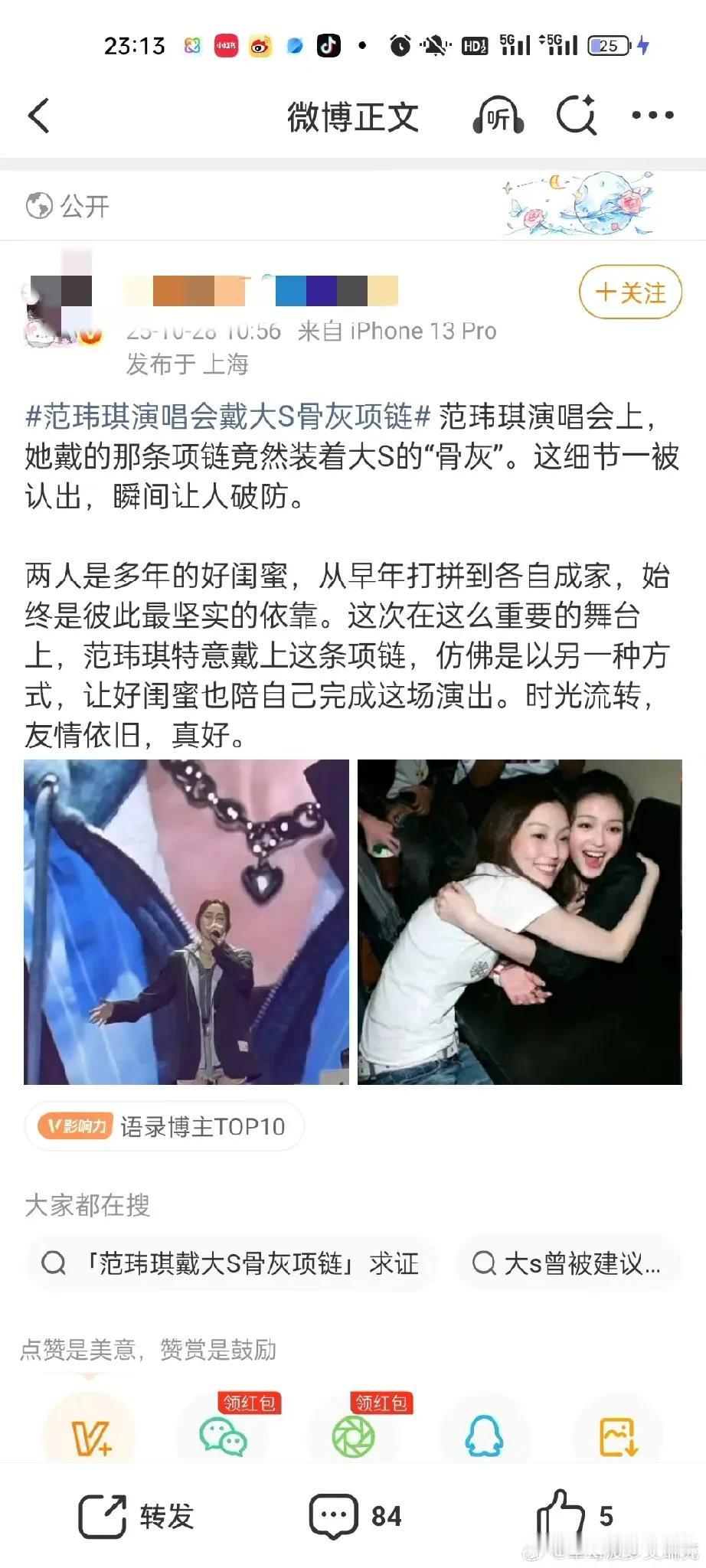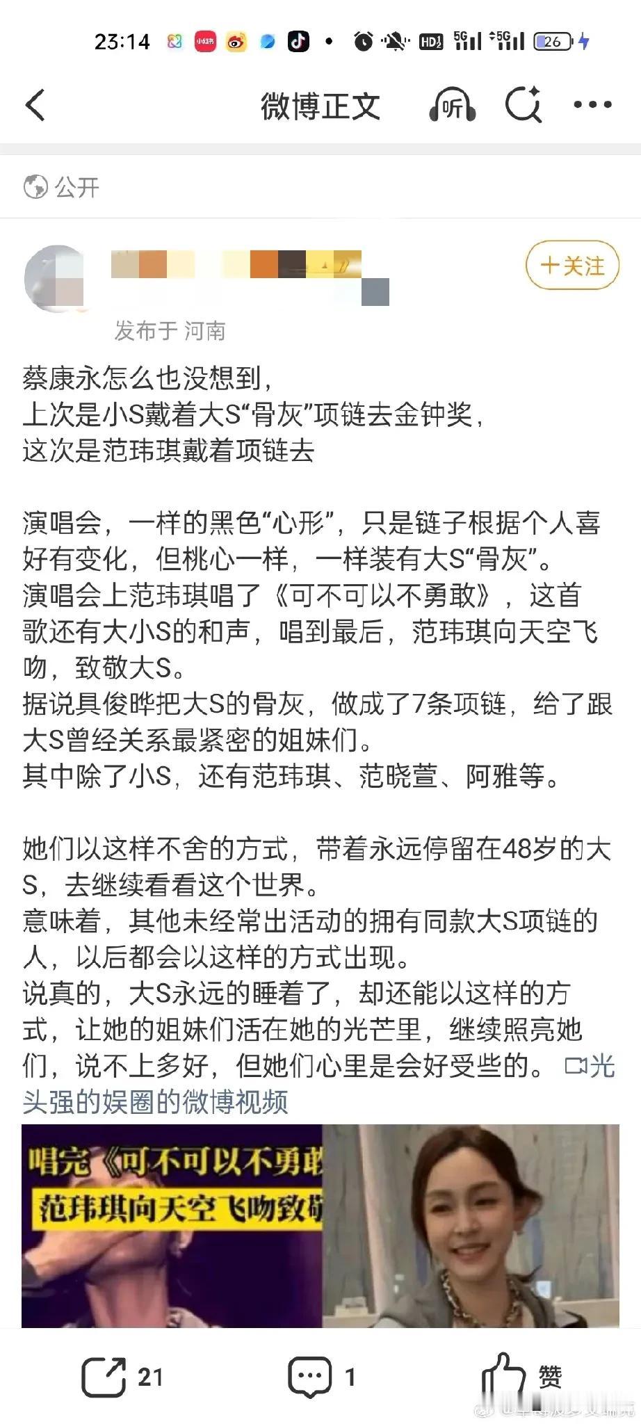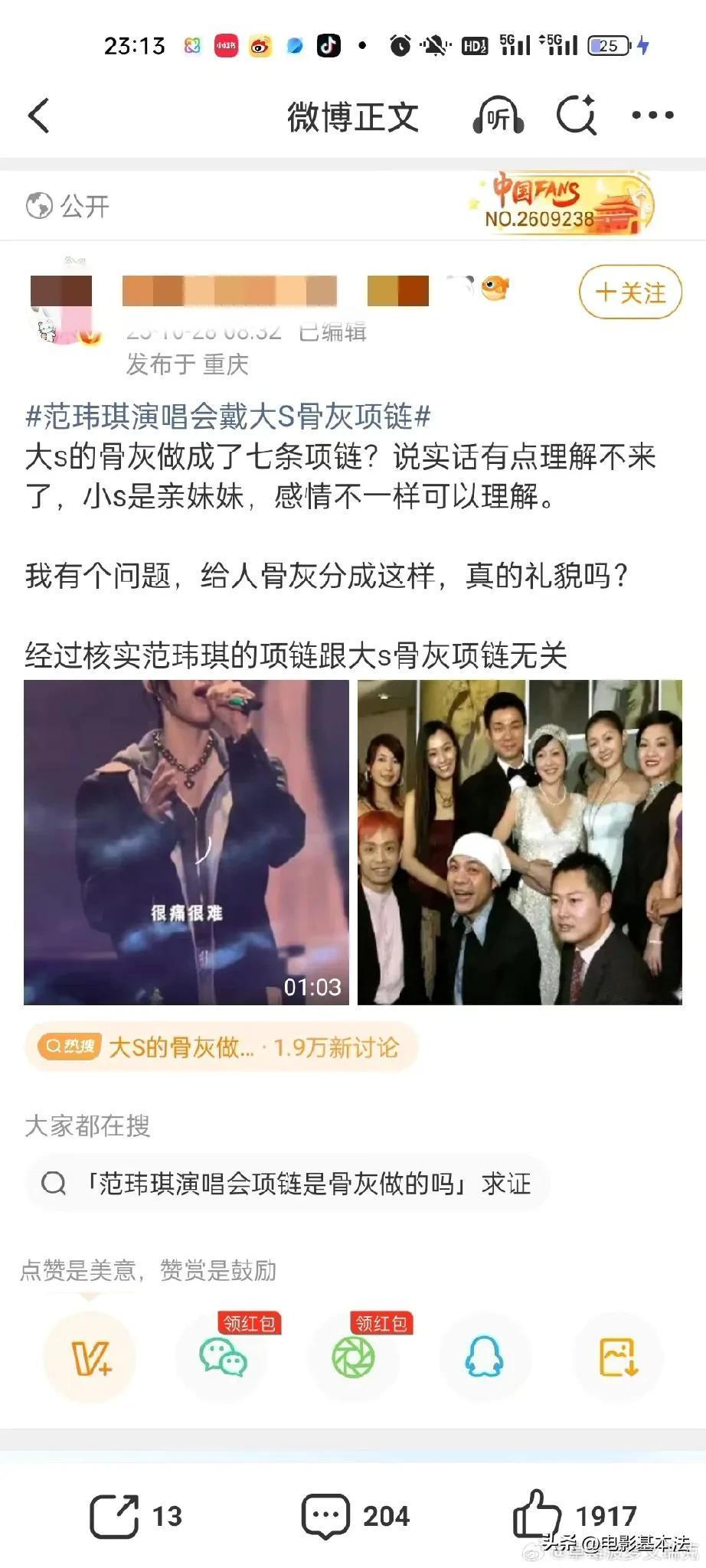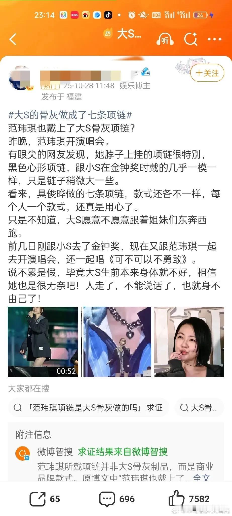 范玮琪,辟谣了! 10月28日晚上20时40分,台湾艺人范玮琪通过内地经纪公司发声,称“范玮琪在演唱会上佩戴大S骨灰项链”是谣言,称范玮琪在演唱会上戴的项链和大S无关,她没有消费大S。 这点我相信范玮琪,没见过哪个艺人去世以后话题还源源不断的,粉丝们自我感动的一塌糊涂,事实上有谁会在公开场合动不动就纪念大S,即使是大S生前的好闺蜜范玮琪。 除了小S,谁会戴别人的骨灰,所以这个传闻确实一眼假,人走后除了遗产其他的都没人真心想要。