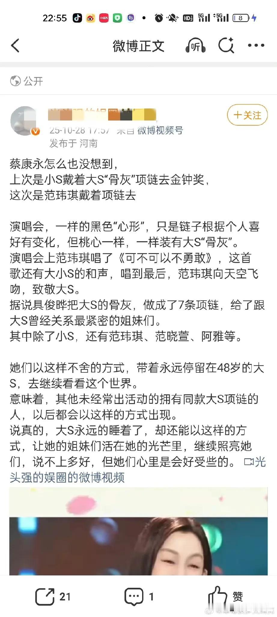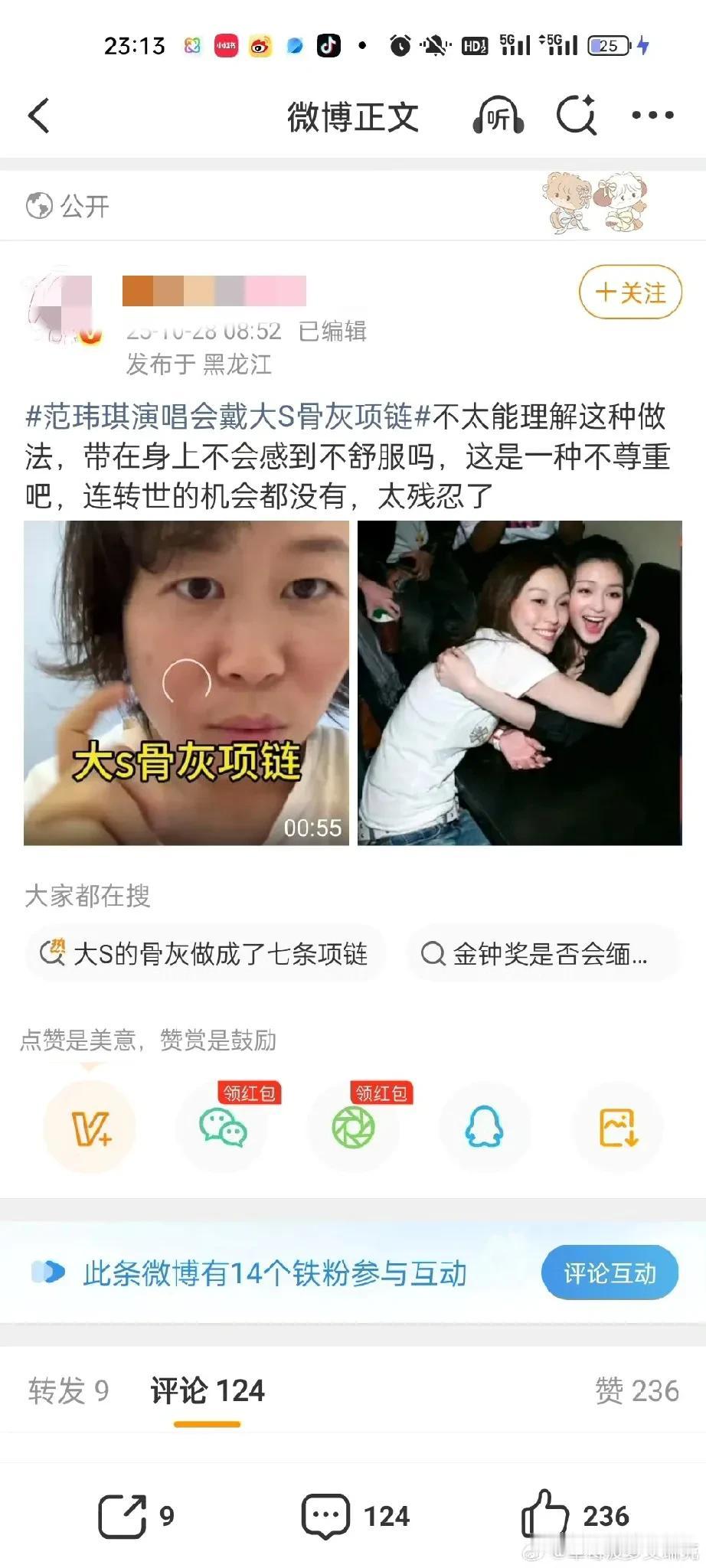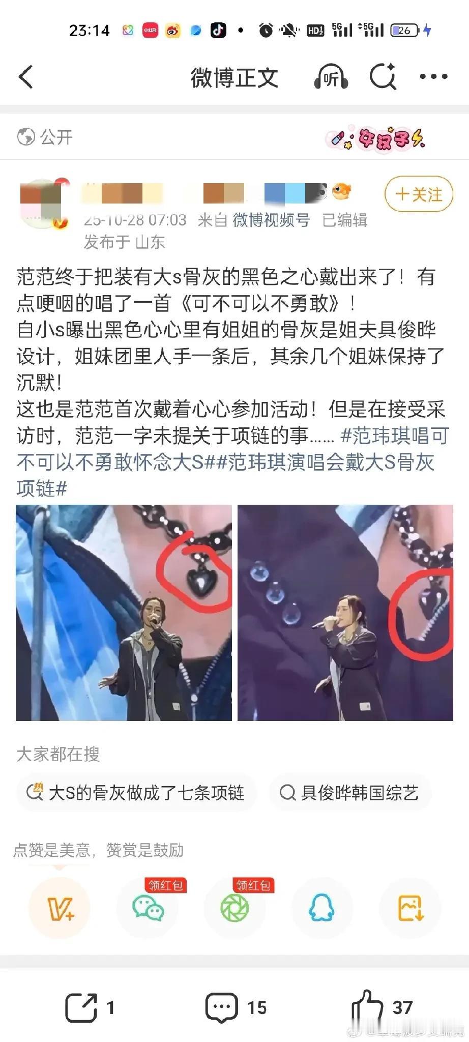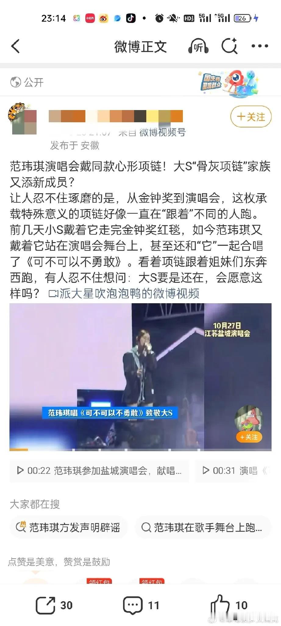 范玮琪,辟谣了! 10月28日晚上20时40分,台湾艺人范玮琪通过内地经纪公司发声,称“范玮琪在演唱会上佩戴大S骨灰项链”是谣言,称范玮琪在演唱会上戴的项链和大S无关,她没有消费大S。 这点我相信范玮琪,没见过哪个艺人去世以后话题还源源不断的,粉丝们自我感动的一塌糊涂,事实上有谁会在公开场合动不动就纪念大S,即使是大S生前的好闺蜜范玮琪。 除了小S,谁会戴别人的骨灰,所以这个传闻确实一眼假,人走后除了遗产其他的都没人真心想要。