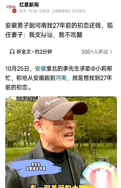 刷到这个新闻,我愣了半天。 一个安徽大哥,千里迢迢跑到河南平顶山,要找27年前的初恋。 你是不是以为又是什么狗血续前缘的戏码? 绝了,是大哥现在的媳妇,亲口劝他去的。 这一下就把我给整不会了。 事情是这样的。 大哥当年跟初恋谈了8年,后来因为家里原因分了,和平分手。 分手后,大哥想创业,没人支持,四处碰壁。走投无路了,硬着头皮给已经分手的初恋打了个电话。 你猜怎么着? 初恋二话没说,直接给他转了一万块。 那可是2001年的一万块啊! 那时候普通工人工资才几百块,这一万块,不夸张地说,是把这个男人从泥潭里拽出来的救命钱。 后来大哥生意做起来了,但手机也丢了,彻底跟初恋断了联系。 这一断,就是二十多年。 这些年,他娶了妻,生了子,日子越过越好。 可心里那块石头,越来越重。 他跟媳妇坦白了这事,说要是没有她(初恋)当年的帮衬,自己走不到今天。 我跟你说,最牛的部分来了。 他媳妇听完,没哭没闹,反而特平静地跟他说: “这成了你的心病了,去吧,去把钱还了,也了却一桩心事。” 我天。 这是什么神仙媳妇?这是什么样的格局和通透? 她太懂了。 她懂她丈夫心里压着的,不是对另一个女人的旧情难忘,而是一个男人对自己良心的交代。 那笔钱,早就不止是一万块了。 那是一个年轻人走投无路时的所有希望,是一个女人在分手后依旧选择相信的全部善良。 现在,大哥在平顶山找了好多天,城市变化太大了,根本找不到。 有人说,别打扰人家现在的生活。 可我觉得,这份寻找,本身就是一种尊重。 还不还钱,还不还得清,有时候不重要。 重要的是,有人把你的好,认认真真记了半辈子。 这比什么都强。