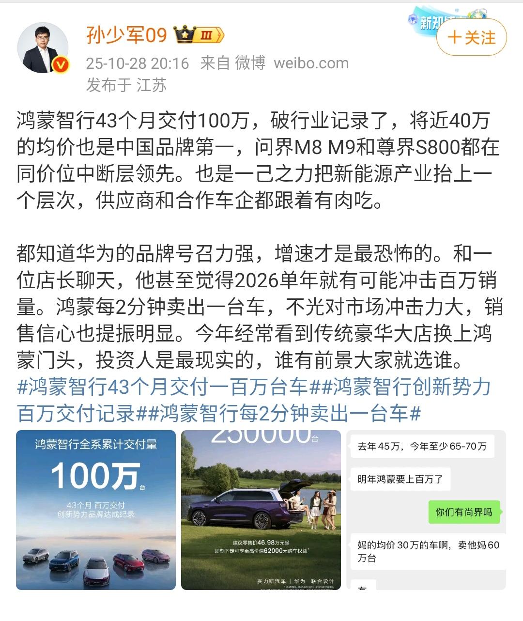 孙少军:鸿蒙智行43个月交付100万,破行业记录了,将近40万的均价也是中国品牌第一,问界M8 M9和尊界S800都在同价位中断层领先! 鸿蒙智行的车型里面应该还有更多的车型等待开发出来,目前也就是问界和尊界是真正的把品牌给立住了,剩下的来的三个品牌还需要继续加油。 车型的迭代需要时间,如何把握消费者对于品牌的感受非常的重要,特别是在价格环节,不同消费人群对价格的敏感度差异实在是太大了,便宜的车型不代表好卖,贵的车型也不一定代表不好卖。 各位是怎么看的?欢迎评论区留言。