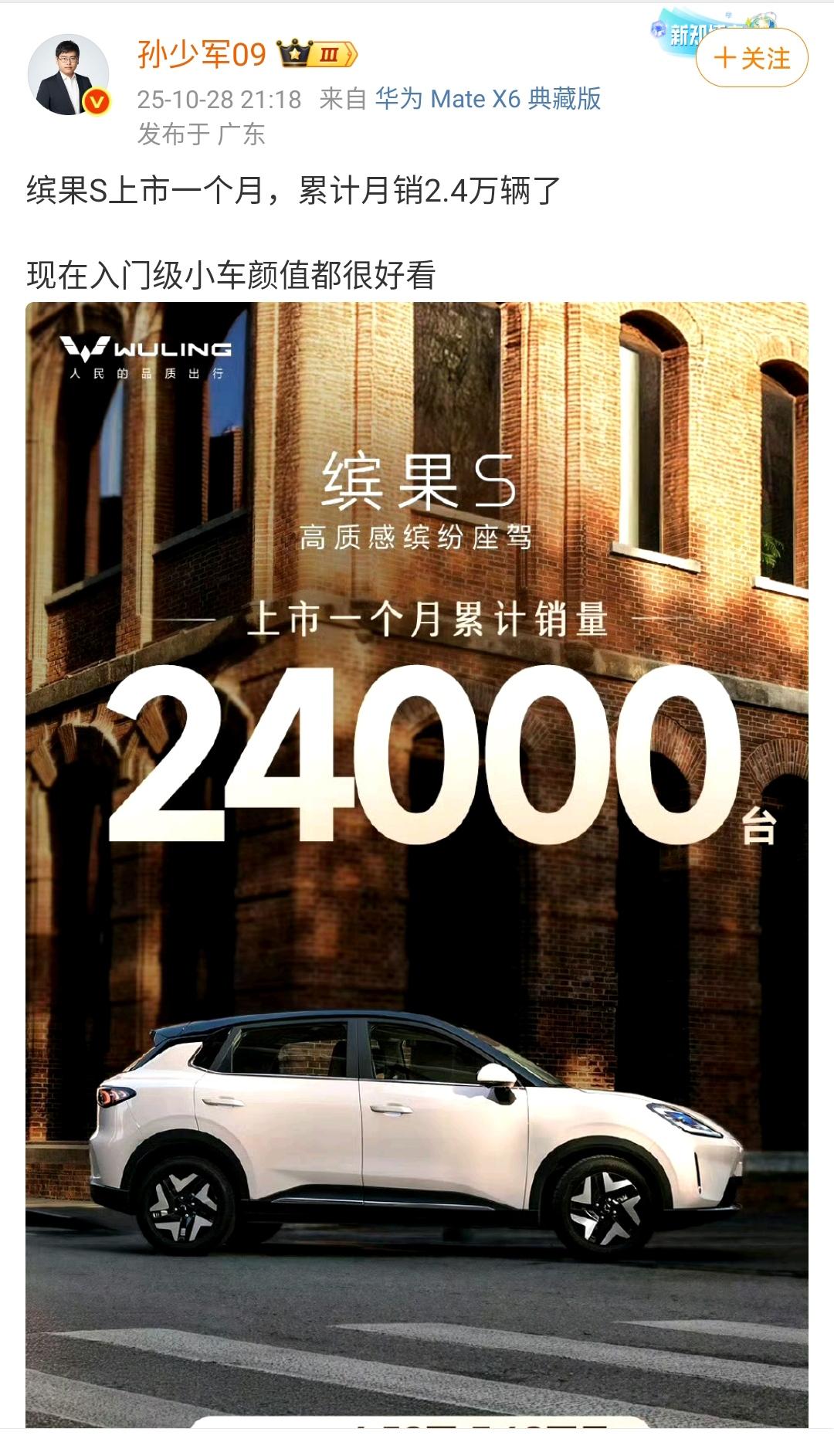 孙少军:缤果S上市一个月,累计月销2.4万辆了! 现在入门级小车颜值都很好看,颜值即正义,想要消费者去看车,第一点就是要求,消费者对这个车得感兴趣。 只有感兴趣了,消费者才会对接下来的事物,感兴趣才会产生购买的欲望。 像五菱这个品牌在全国的经销商都特别的多,有的小经销商可以说就是那种路边卖车的,但是这种路边卖车的一样可以将车卖得出去。 各位是怎么看的?欢迎评论区留言。