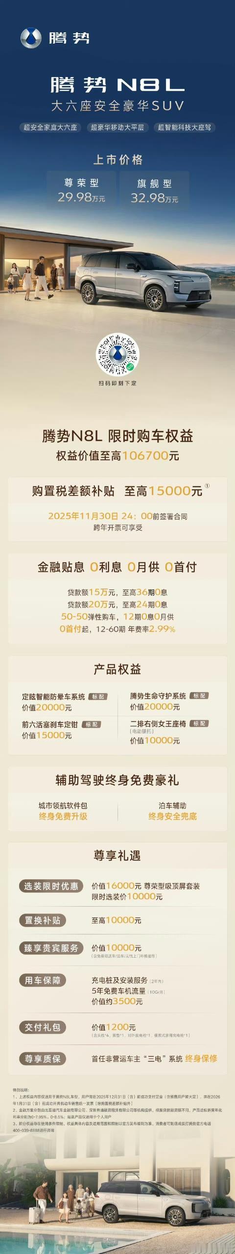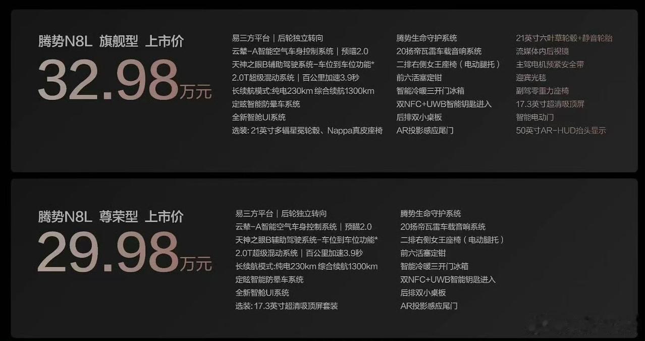 孙少军:腾势N8L正式上市,价格一步到位,起步价29.98万! 这个价格可以说消费者很难不心动,在品牌定位上,腾势品牌比方程豹的品牌还要高非常多。 腾势现在这个定价策略又如此的积极,相信这款车会取得不错的销量。各位是怎么看的?欢迎评论区留言。