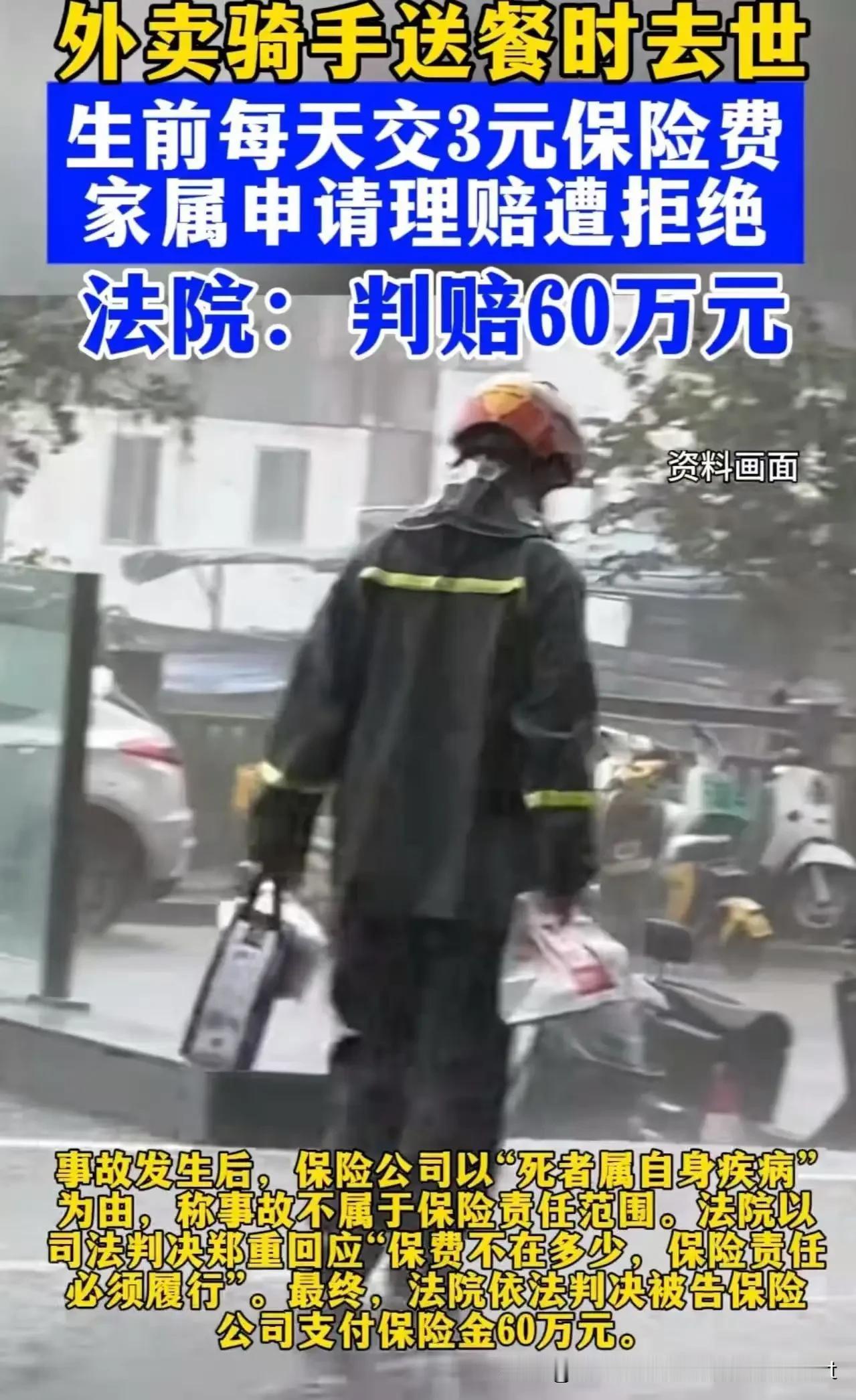 i 近日,郑州发生的一起外卖骑手送餐途中不幸去世事件,再次引发社会对劳动保障和保险责任的热议。事件的核心在于,一位每天仅交3元保险费的外卖骑手在意外中身故,保险公司拒绝理赔,令人扼腕叹息。幸运的是,法院最终判决保险公司赔偿60万元,为受害者家属讨回了公道。这一判决不仅彰显了法律的正义,也引发了公众对保障体系的深刻反思。 据报道,这位外卖骑手每天只交3元保险费,试图用微薄的保障为自己争取一份安全保障。然而,面对突如其来的意外,保险公司却以各种理由拒绝赔偿。这不仅让受害者家属陷入困境,也暴露出当前部分保险产品保障力度不足、责任界定模糊的问题。 法院的判决明确指出,保险公司应履行合同责任,赔偿60万元,彰显了法律对于弱势群体权益的保护。这一判决无疑是对“只收钱不赔偿”现象的有力反击,也提醒保险行业应坚守责任底线。 事件一经披露,便引发网友的广泛关注。有人指出,低保费的保险产品是否真的能提供应有的保障?有人呼吁,不仅要依法理赔,还应加倍赔偿,以体现对生命的尊重和社会的公平正义。 此外,这一事件也让人们关注到外卖行业劳动者的权益保障问题。作为一线劳动者,他们的安全保障体系亟需完善。无论是保险产品的责任范围,还是劳动保障措施,都应与时俱进,确保每一位劳动者在面对突发事件时,都能得到应有的保护。 这起事件折射出当前保障体系中存在的诸多问题:部分保险产品保障不足,责任界定不清,低保费产品难以兑现保障承诺。更重要的是,企业和监管部门应共同努力,强化对劳动者权益的保护,落实责任,杜绝“只收钱不赔偿”的现象。 同时,社会也应关注低保费保险的实际保障力度,推动行业标准的提升,让保障成为真真正正的“守护伞”。 这次法院的判决,是对受害者家属的正义回应,也是社会对劳动者权益保护的呼声。未来,我们期待制度的不断完善,让每一份保障都能落到实处,让每一位劳动者都能在风险面前多一份安心。在保障体系的建设中,责任与担当永远是不可或缺的核心。送外卖事故 外卖员光荣事件 外卖员翻车事故 外卖员理赔