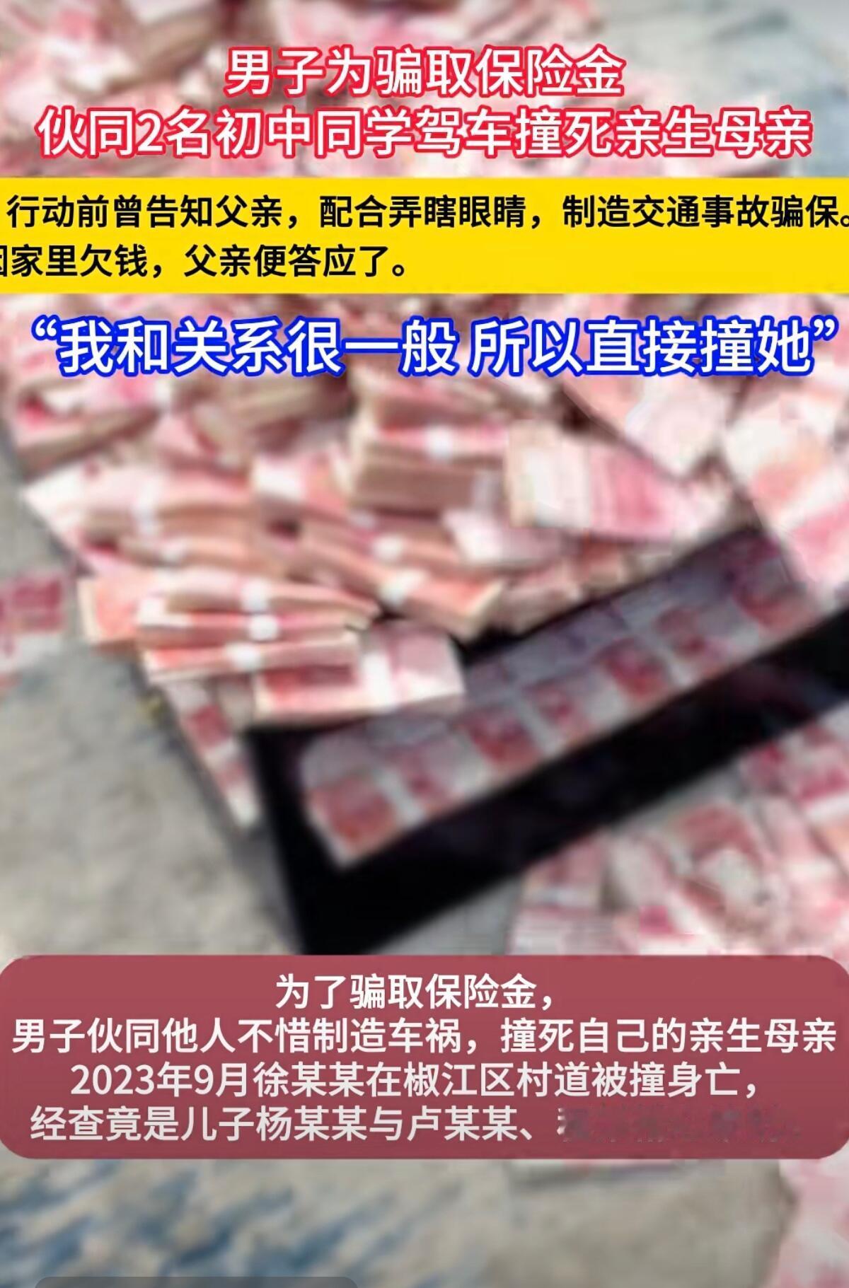 这事儿真是丧心病狂!浙江台州一个姓卢的男的,为了骗保险金,竟然伙同两个初中同学,把自己亲妈给撞死了。 事情得从2023年7月说起。卢某他妈之前出车祸得了31.9万赔偿款,结果被他跟一个姓杨的同学偷偷转走。俩败家子两天就把钱造光了,买手机、租豪车旅游,钱花没了就开始动歪脑筋。姓杨的更是在手机上搜“撞死人保险赔多少”,然后就跟卢某说:“你妈不是有保险吗?撞死了能赔上百万!” 就为了这笔钱,他们开始策划怎么弄死他妈。先是试着“练手”,卢某骗他妈说去外婆家,想拿钉子戳瞎她眼睛,但没敢下手。后来又把目标转向他爸,用树枝戳眼睛伪造追尾,结果只骗到一千多块钱。两次没成,姓杨的干脆说:“直接撞死你妈算了!”而卢某居然因为“跟妈关系不好”就同意了,还说对爷爷下不去手,对亲妈倒能狠下心。 他们选了个没监控的村路,查了速度,说70码就能撞死人。计划让姓杨的开车,卢某把他妈骗出来,另一个姓程的同学跟着壮胆。连中秋节都嫌“不吉利”,特意拖到9月30号晚上才动手。结果真就一车撞过去,他妈当场死亡,三人还假装报警说是意外。 但假的终究是假的。保险公司发现卢某刚拿过理赔款却还在到处借钱,起了疑心。警方一查,他手机里还有“聊天记录赶紧删”这种信息,很快就全露馅了。 今年4月底,法院一审判决:主犯杨某和卢某死刑,程某判了7年。法官说他们“违背人伦,动机卑劣”。现在案子还在二审,可人死不能复生。为了钱连亲妈都能杀,这种恶,真的让人脊背发凉。