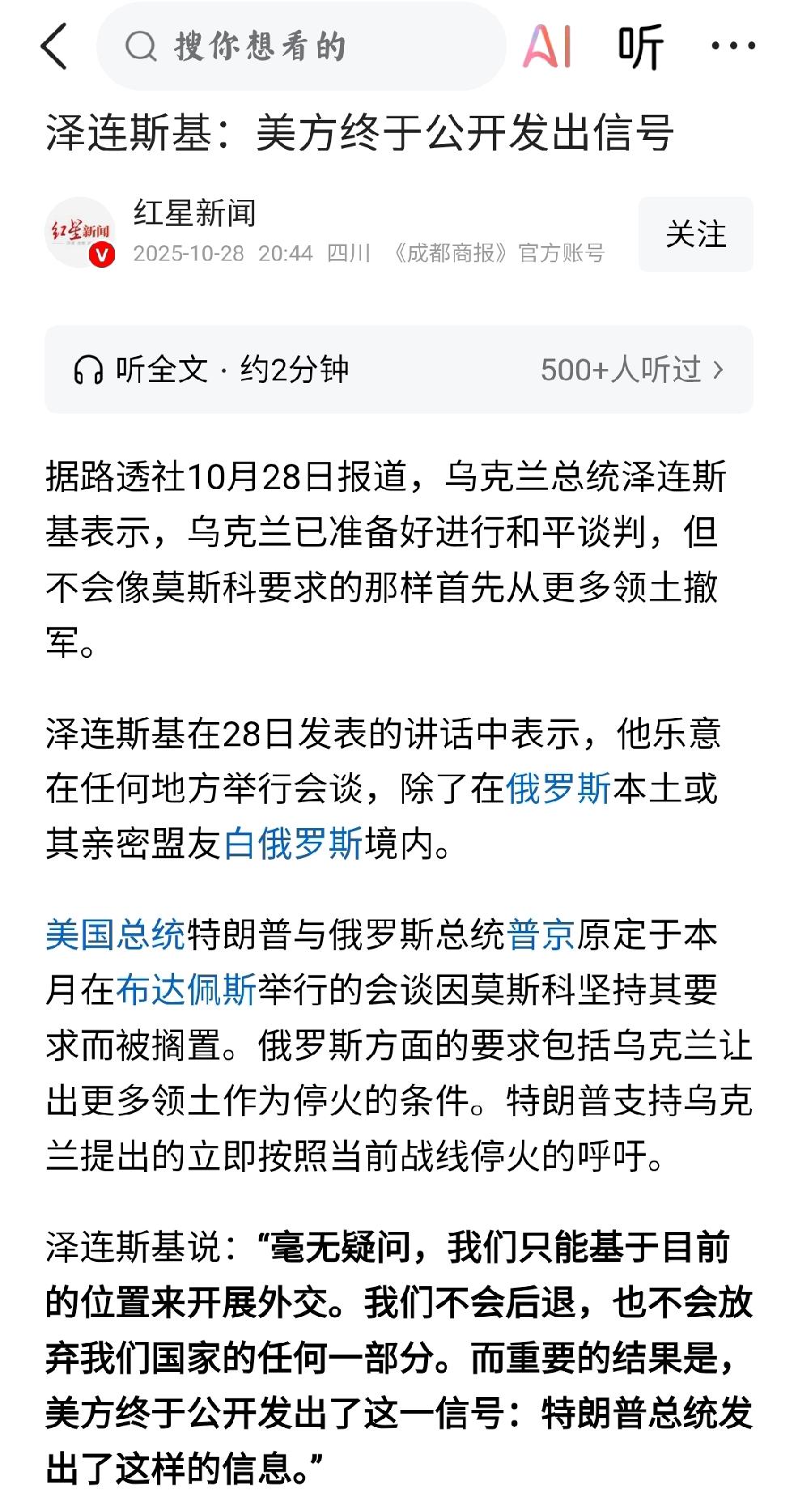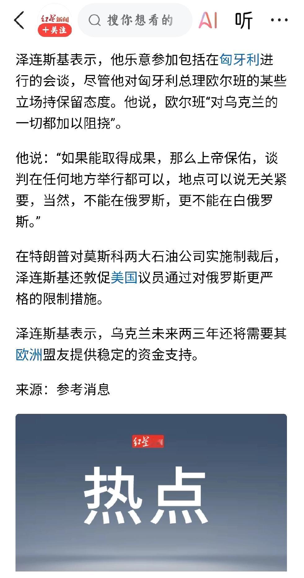 泽连斯基:高调演戏 个人观点:泽连斯基又发挥了演员本能,高调演戏,当下一切的言论都是为了缓口气,让欧盟和美国,援助资金,援助人员,援助武器,方便乌克兰继续作战。停止援助,乌克兰马上就会停战。