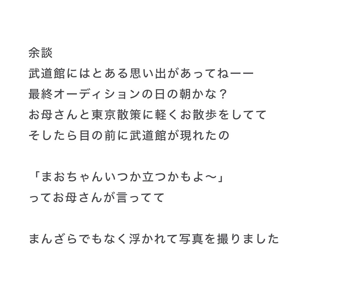 五百城茉央「こんなに短いのは、人生で初めてです…どうだろうか…メンバーが居る楽屋に入る時、自意識過剰になる気持ちと、誰も見ないでくれーという気持ちが入り交じっていました笑。しかしそんなソワソワも端に追いやられるくらい、先輩同期後輩がいいね!って沢山言ってくださって、とっても嬉しかったなっ。新・私の気持ちです。」