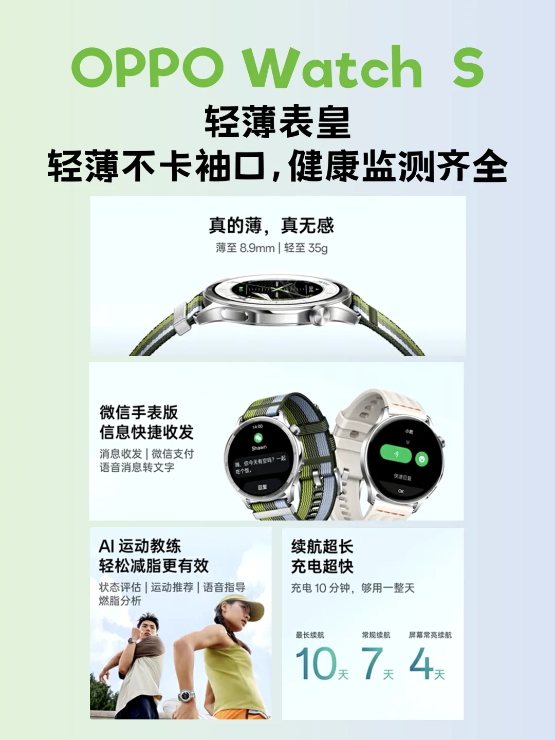OPPO Watch S适合上班族,这块表很轻薄,出行戴着无感,适配职场穿搭不卡袖口,还能监测压力、60秒体验,方便健康管理,晚上睡觉戴着监测睡眠也没啥感觉。双十一不到1300拿下,个人觉得跃动绿茵版本颜值高一点。