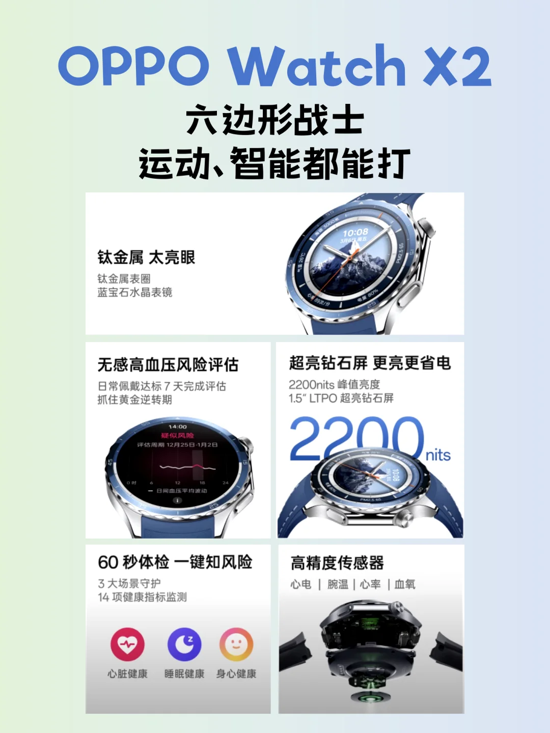 OPPO Watch X2适合户外健身党,这块表可以说是六边形战士,运动功能完备+eSIM,不带手机也能用,还有无感高血压风险评估等健康功能,智能化也够高,颜值更不用说~双十一预计2100出头到手。