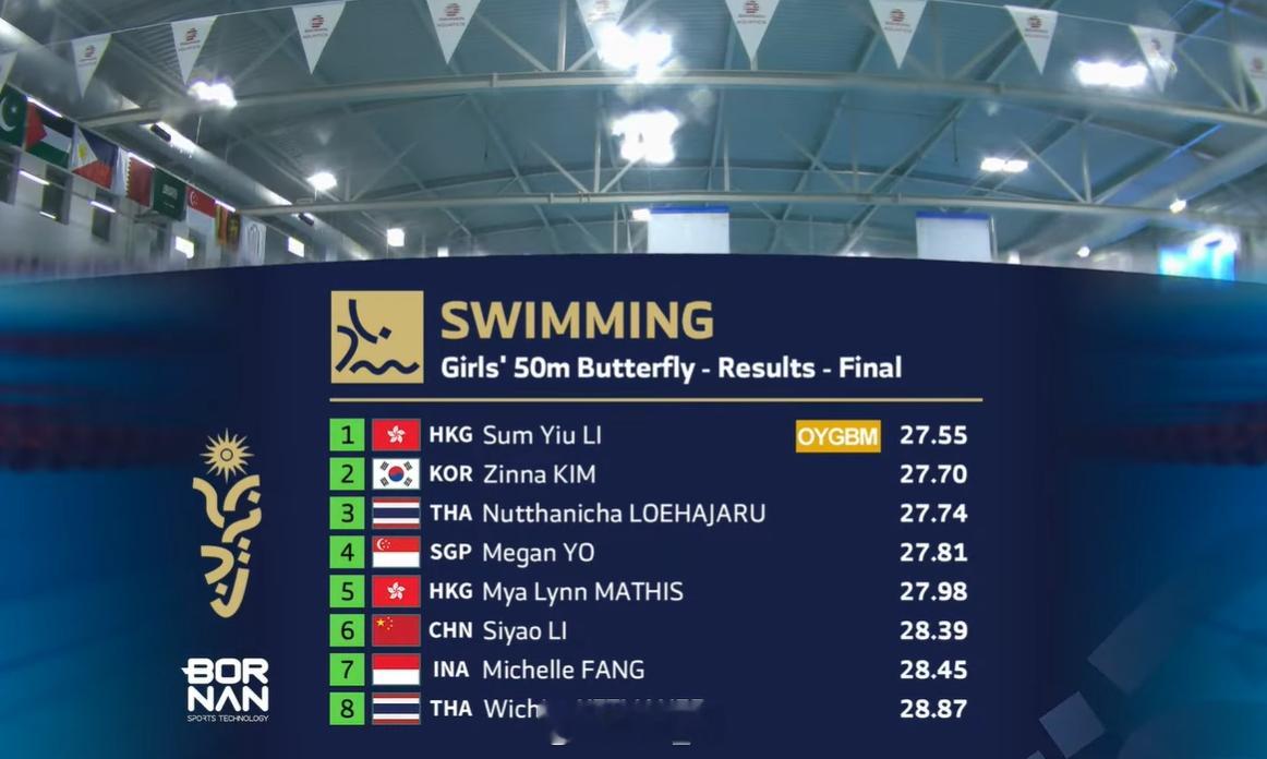 亚洲青年运动会 女50蝶决赛李芯瑶 27.55 CR李思瑶 28.39
