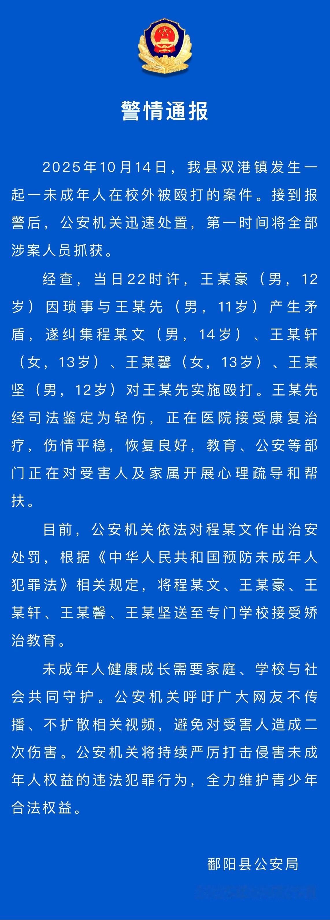 江西鄱阳警方通报11岁男生被5人校外殴打:男生经司法鉴定为轻伤 伤情平稳,正对其及家属开展心理疏导和帮扶。5名打人者(三男两女)被送至专门学校接受矫治教育。