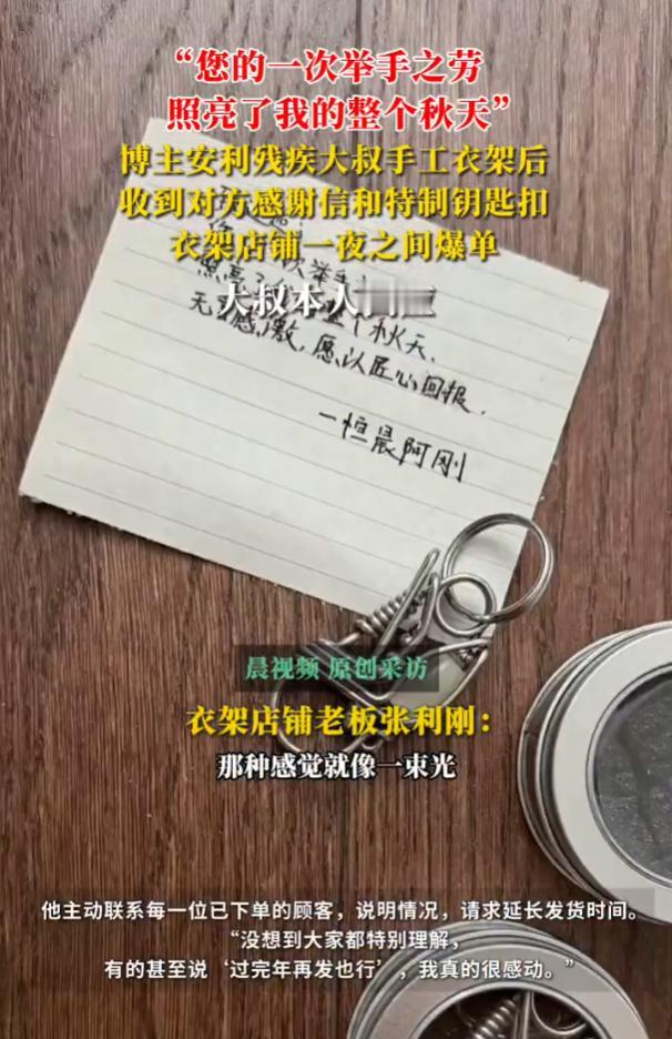 “感恩的心!”10月27日,山东,一位双腿瘫痪的张利刚大叔,手工制作的不锈钢衣架最近在网络上因为一位博主的安利走红,订单量猛增后,大叔为博主赠出感谢信和特制礼物。[得意] 张利刚因身体原因,曾从事网店客服工作,因收入难以维持生活,四年前开始学习制作手工不锈钢衣架。 他做的衣架选用加厚不锈钢材质,焊接点均匀牢固,边缘都经过细致打磨,一位博主购入使用后,发现衣架承重强且不易变形,随后在网上发文推荐。 这位博主收到了张利刚寄来的感谢信和一个手工制作的钥匙扣,钥匙扣上的装饰珠子是他特意从妻子的手链上取下来的,张利刚通过媒体表示,自己没什么贵重物品,唯一能表达谢意的就是这点手艺。 博主的第二次分享让更多网友注意到了张利刚的店铺,短时间内,订单量急剧增加,小店一度面临发货压力。 面对激增的订单,张利刚保持了稳定的工作节奏,他每天固定制作50单约500个衣架,不熬夜加班,也不简化工艺流程。 目前还有超过740单在排队等待发货,他主动联系每位顾客说明情况,请求延长发货时间,顾客们都表示理解,有人回复说即使年后发货也没问题。 张利刚的工作台设在自家院子里,每道工序都靠双手完成,从裁切钢管、焊接成型到抛光处理,一个衣架要经过十多道工序,他特制的衣架比普通衣架厚实,每个挂钩都反复弯折测试确保耐用。 “我得对得起每位顾客的信任,”张利刚在接受采访时说,“宁愿慢一点,也要保证每个衣架都牢固耐用,”他的妻子负责帮忙整理材料和打包发货,夫妻二人配合默契。 张利刚每天清晨开始工作,根据订单情况合理安排生产,他说这样既能保证质量,也不影响身体。这种负责任的态度反而赢得了更多顾客的信任。 这温暖的故事还有另一半,那就是来自全国网友的评论,这些留言和大叔的衣架一样,充满了人情味。 “现在有些网红店订单一多就飘了,要么质量下滑,要么态度恶劣,但张大叔能主动联系顾客说明情况,还不熬夜保重身体,这份实在和真诚太珍贵了。” “他卖的不只是衣架,更是一份承诺,这种对产品、对健康、对顾客都负责的态度,才是真正的‘爆单’密码。” “这才是网络助人的正确打开方式,不是施舍,是发现了真正的宝藏”。 “在这个什么都追求快的时代,有人愿意为你慢下来,也有人愿意耐心等待,这种感觉真好。” “拿到手就知道,分量十足,边缘打磨得特别光滑,确实是用了心做的东西。” “大叔突然这么累身体能不能吃得消,希望他能招个帮手或者想想办法提高效率,别累坏了。” “这种‘爆火’之后的长远问题,是坚持小作坊模式,还是适度发展成一个小品牌,这确实是个幸福的烦恼。” 如果你也下单支持了大叔,你愿意耐心等待你的衣架吗?或者,对于这种“手艺人突然爆红”的现象,你觉得怎样才能走得更远、更稳?一起来评论区聊聊你的看法吧! 信源:潇湘晨报