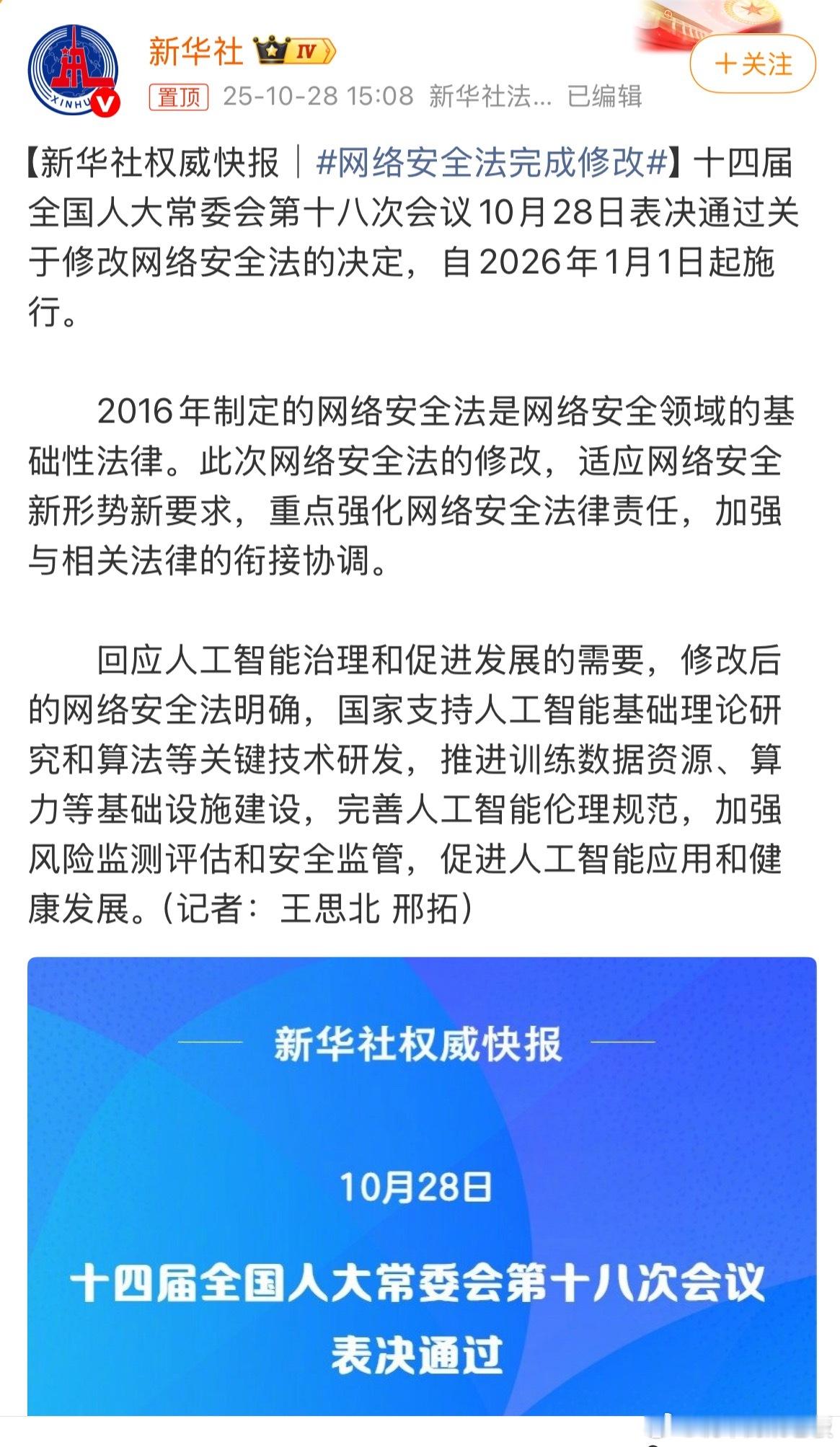 网络安全法完成修改网络安全法 这次修法既给AI创立了规矩,又强化了个人信息保护,认同、支持!