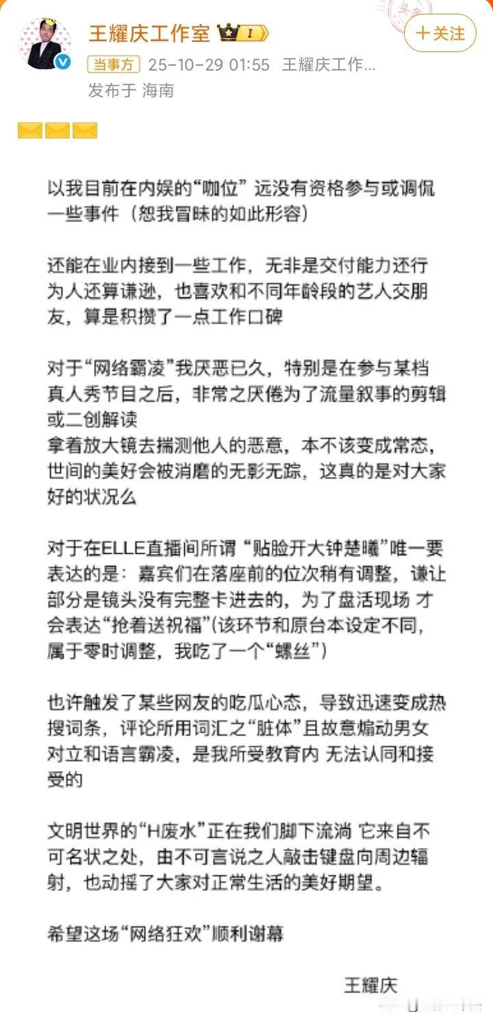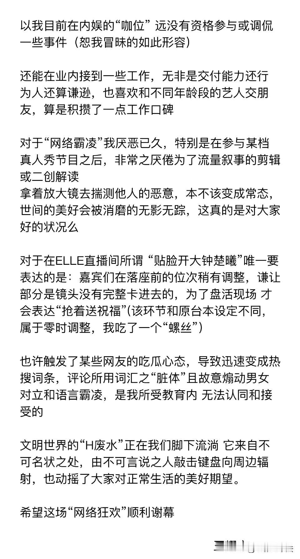 王耀庆太冤了!明明是想给钟楚曦一个澄清的机会,但是因为钟楚曦没接住,反而坐实了自己抢C位的事,结果王耀庆就被钟楚曦粉丝迁怒网暴了,气的一向好脾气的王耀庆说这些人是“文明世界的H废水”。 印象中王耀庆豁达幽默,能开得起玩笑,是一个放得下架子玩各种梗的“搞笑”艺人,这种艺人对不完美的声音容忍度是比较高的,能把王耀庆逼到很生气不得不发声的地步,只能说某个群体确实过分了。 不得不说,同为台湾省艺人,王耀庆比某些“没人性”的要体面、客观的多。