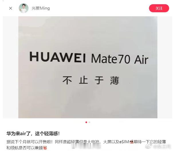 华为Mate70Air海报曝光拍摄角度问题,看不出来Mate70 Air到底有多薄,隐隐感觉可能比iPhone Air更薄[doge]