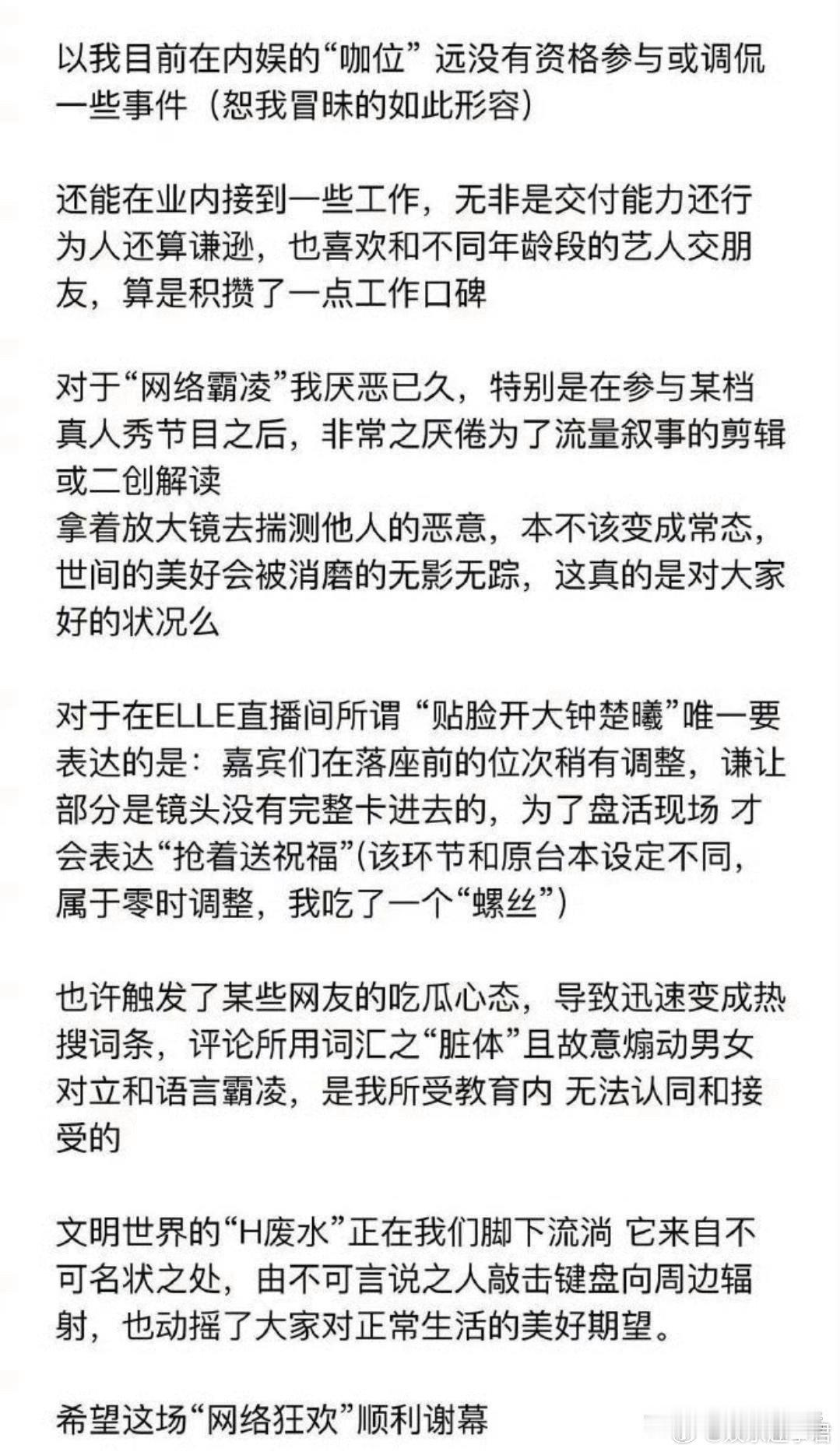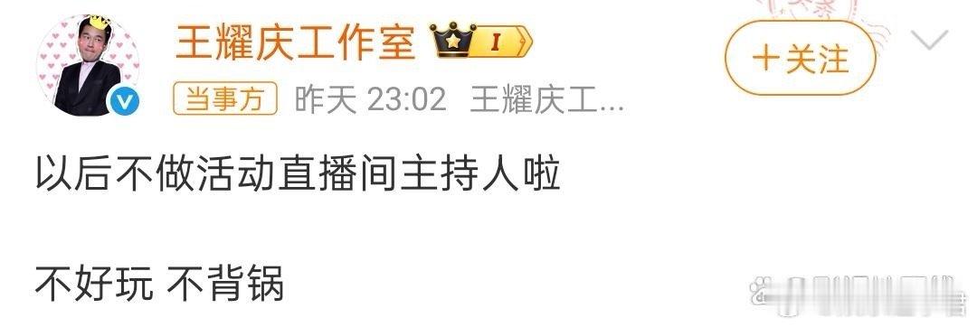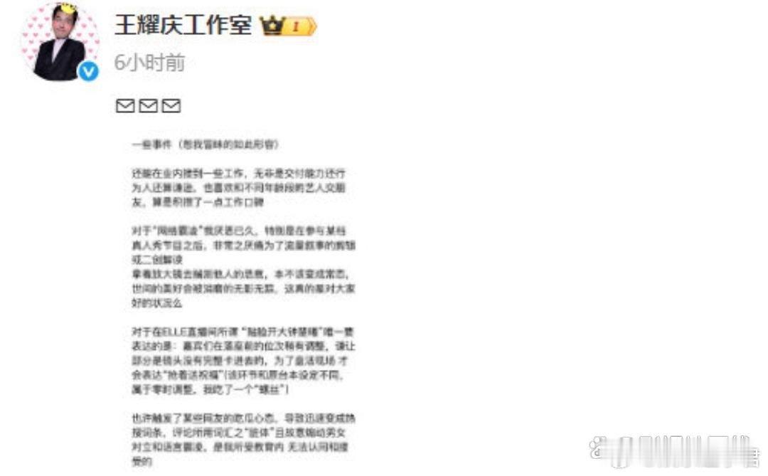 王耀庆工作室回应29日凌晨,王耀庆方再发长文回应称:“以我目前在内娱的‘咖位’远没有资格参与或调侃一些事件”,“为了盘活现场,才会表达‘抢着送祝福’”,并表示十分厌恶网络霸凌,“希望这场‘网络狂欢’顺利谢幕。”