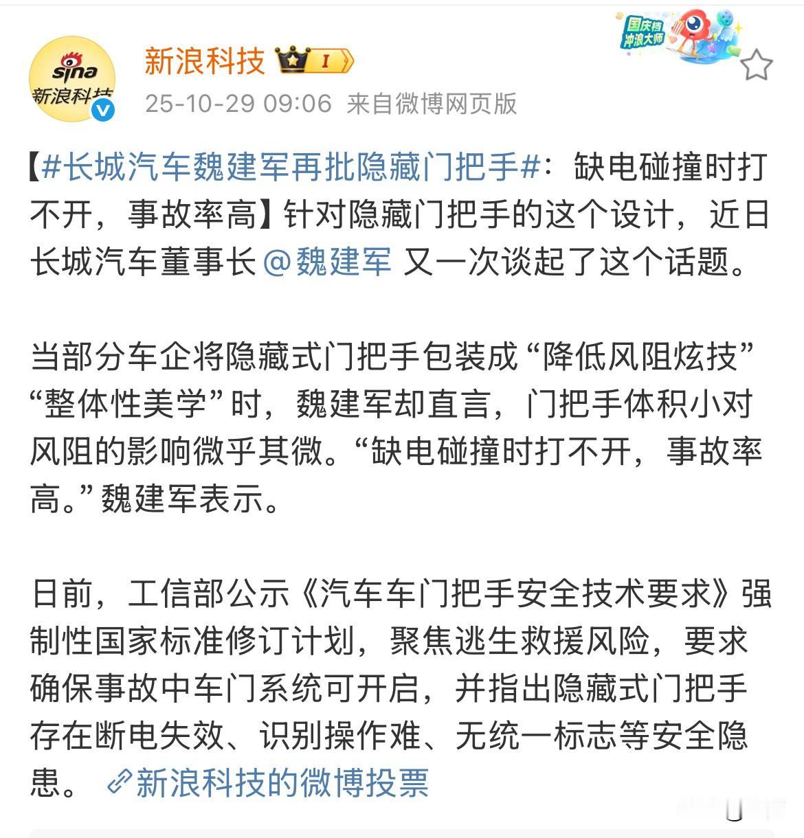新浪科技:魏建军再批隐藏门把手! 就在刚才,新浪科技报道了这条消息,一向快人快