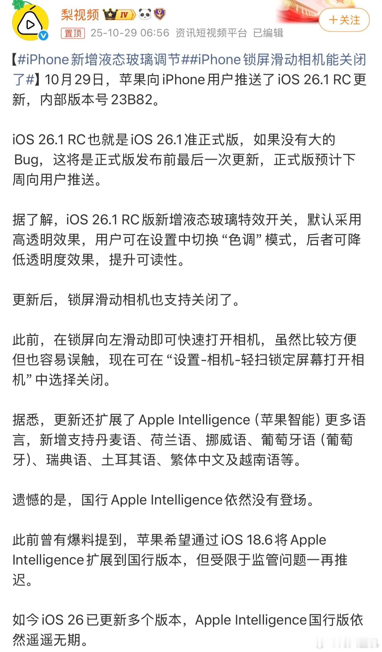 iPhone锁屏滑动相机能关闭了虽然锁屏界面的相机设置有的时候很方便,但有的时候也极其容易误触,手机经常放在口袋里,一不注意就发现录了几段视频,基本上就是误触导致的,可以关闭了也好,选择权交给了消费者。