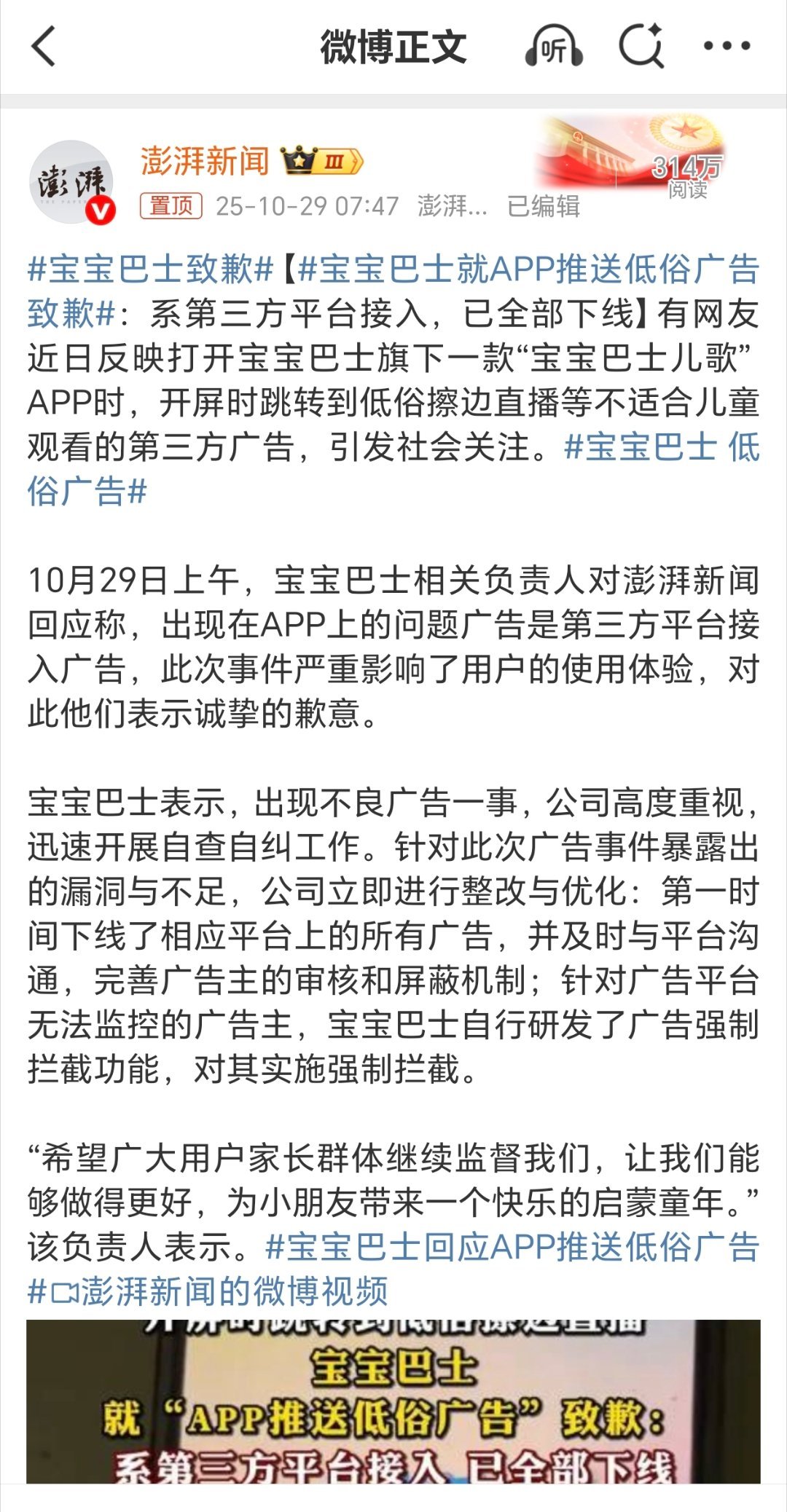 宝宝巴士致歉宝宝巴士:系第三方平台接入,已全部下线。其实很多APP在接入广口之前应该严格把关好好审查的。现在很多平台各种擦边现象也应该好好审查。
