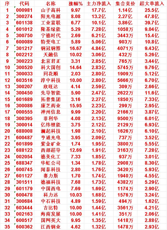 10月29日开盘45分钟,主力资金“买入的 ”的35名单一览 山子高科:主力净流入 17.7亿元 阳光电源:主力净流入 13.2亿元 工业富联:主力净流入 10.1亿元 隆基绿能:主力净流入 7.28亿元 宁德时代:主力净流入 6.21亿元