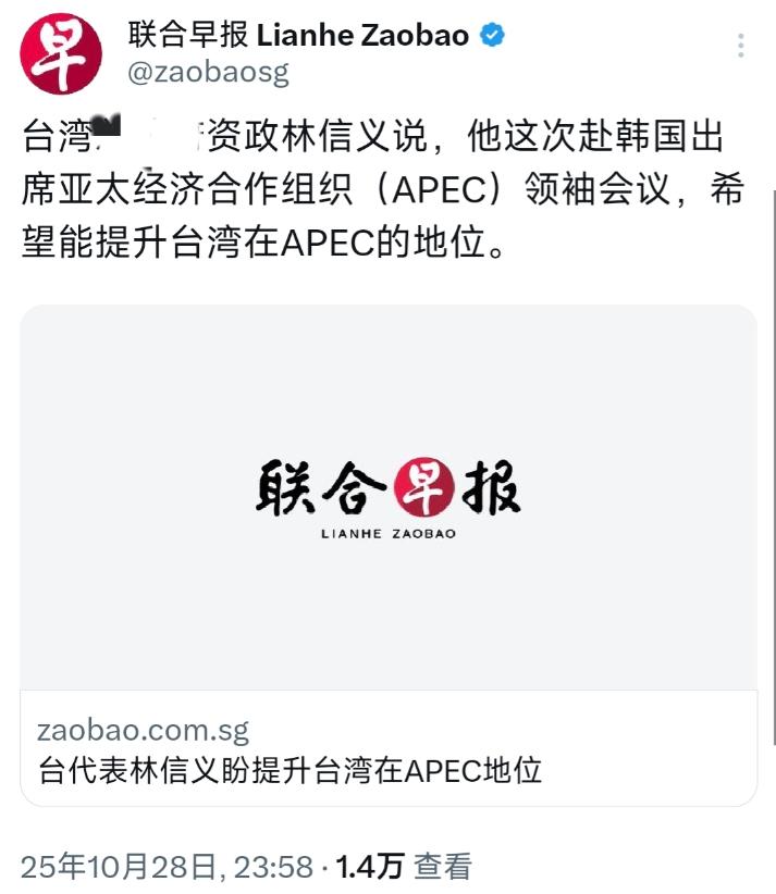 台湾代表林信义表示,他这次赴韩国出席APEC会议,希望能提升台湾在APEC的地位。林信义指出:“跟川普总统,我们永远在争取跟他会面的可能性”。 林信义这话听着挺热闹,又是想“提升地位”,又是盼着见特朗普,可说白了,还是想借着开会搞“台独”,压根没搞清楚台湾能去APEC,到底是凭啥。先把实话说透,台湾是中华人民共和国的一个省,连联合国都认中华人民共和国是代表中国的唯一合法政府,APEC里给台湾的那点安排,本质就是在一个中国原则下,给的地区经济体名额,哪来的“提升地位”的空间啊? 1991年咱们和APEC签的协议写得清清楚楚,中国是以主权国家身份加入的,台湾只能用“中国台北”的名儿,还得答应三件事,不用“中华民国”的名头,只能派管经济的官员去参会,“外交部”的人最多只能是司长级别的去。 这么多年下来,台湾去APEC的,从来都是“经建会主委”或者“经济部长”,连行政机构的副职都没资格去,更别说搞什么“地位升级”了。林信义说这话,明显是揣着明白装糊涂,想借着国际会议的幌子,往“台独”上靠。 再说说想跟特朗普见面这事儿,更不现实。先不管特朗普现在啥身份,就算他还是美国总统,国际上跟人打交道都有个底线,一个中国原则。所有国家都清楚台湾是中国的一部分,哪有主权国家的领导人,跟中国一个省的代表搞“正式见面”的道理? 更别说APEC本身就有规矩,台湾参与的范围严格限定在经济领域,连“外长”都不准去参会,想靠蹭着见个人刷“国际存在感”,纯粹是白费功夫。 这种“借开会搞台独”的套路,也不是第一次见了。早年间陈水扁就想把台湾在APEC的名儿改了,把“中国”俩字儿去掉,结果呢?国际上没人理他,还被戳穿是搞“台独”的小把戏。国台办早把话说透了:台湾能以地区经济体身份去APEC,前提是得符合一个中国原则,但凡想耍花招搞“台独”,最后都是自己丢人。 其实核心道理特简单:台湾能在APEC有个位置,是中国给的,不是自己争来的。不管是亚洲开发银行,还是世贸组织,台湾能参与的这些国际组织,全是先经过中华人民共和国政府同意,以不是主权国家的身份加入的,能活动的范围也只能是经济、文化这些非政治领域。 林信义想“提升地位”,本质就是想突破这个框架,把地区经济体包装成“国家”,这根本碰了一个中国原则的红线,怎么可能成啊? 说白了,台湾在APEC的“地位”,从来不是靠嘴说争来的,而是基于一个中国原则的明确安排。林信义与其琢磨着怎么蹭着见个人、炒炒热度,不如好好想想怎么借着APEC的平台,多干点儿对两岸经济合作有好处的实在事儿。至于那些“搞台独”的小心思,以前没成过,现在更没门儿,毕竟全世界都认一个中国,这规矩,谁也绕不过去。