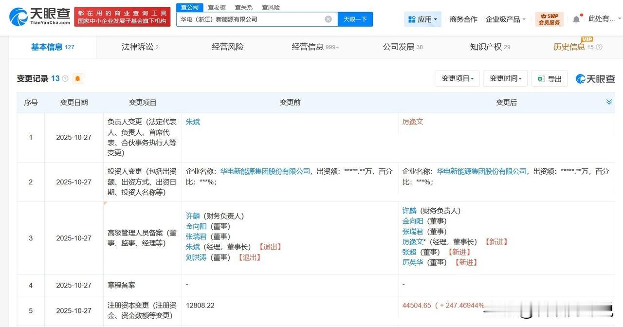 【华电浙江新能源公司增资至约4.45亿 增幅约247%】 天眼查工商信息显示,近日,华电(浙江)新能源有限公司发生工商变更,注册资本由约1.28亿人民币增至约4.45亿人民币,增幅约247%,同时,多位主要人员发生变更。 该公司成立于2022年6月,法定代表人为厉逸文,经营范围为发电业务、输电业务、供(配)电业务,发电技术服务,风力发电技术服务,太阳能发电技术服务,节能管理服务。股东信息显示,该公司由华电新能(600930)全资持股。 天眼查信息:
